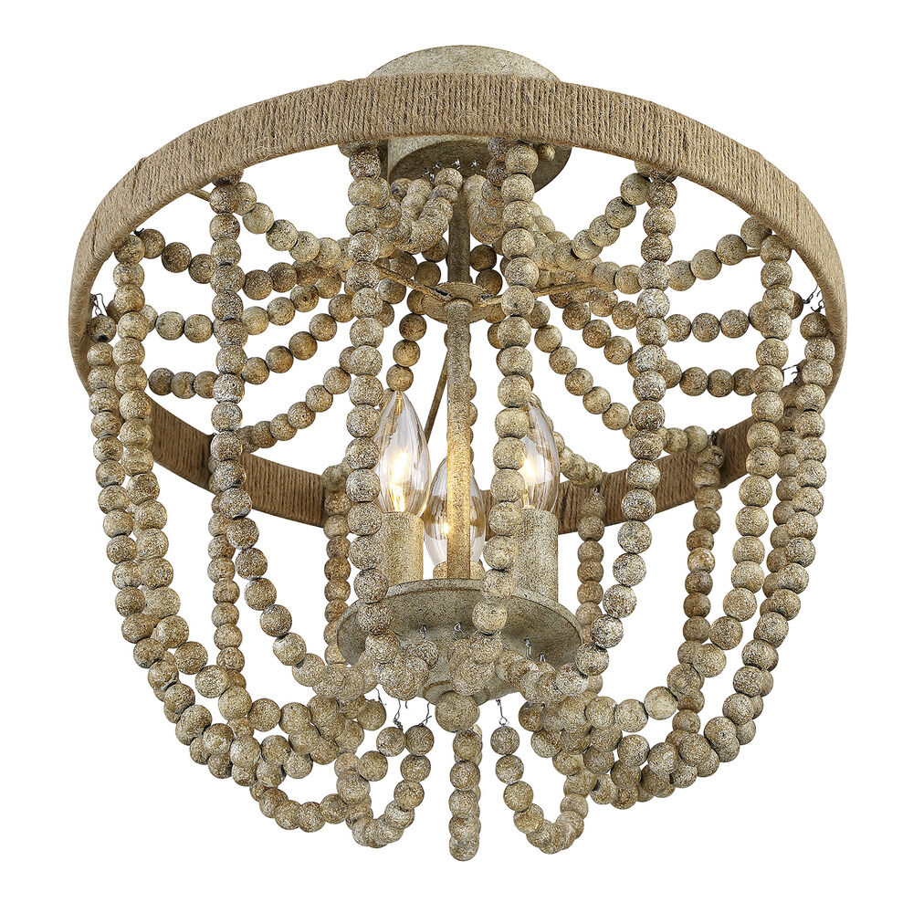 Add textural elegance to your bedroom or living space with this stunning semi-flush mount by Meridian. This piece features a classic shape and structure, but with a more rustic or natural twist. This ceiling light consists of a metal frame in a Natural Wood finish. It features swooping strands of wooden beads, as well as a natural rope that wraps rightly around its circular frame.