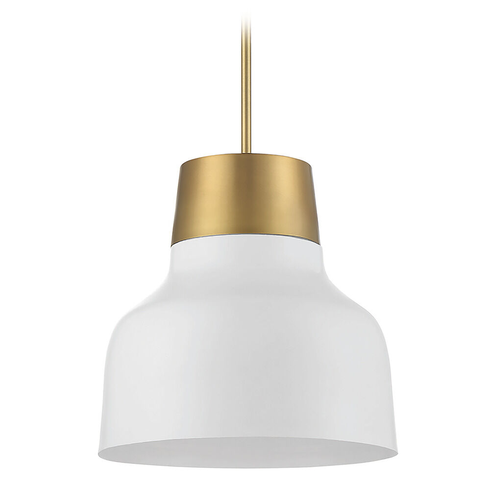 Illuminate your bar or workspace with this vintage-inspired pendant by Meridian. This pendant features a White metal shade with a Natural Brass accent. This fixture's hardware is also in a Natural Brass finish. Included are four 12-inch rods and one 6-inch rod.