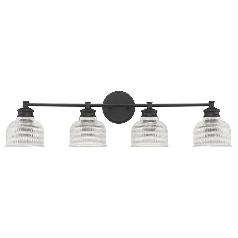 Illuminate your bathroom with this farmhouse-style bathroom light by Meridian. This unique fixture features a round backplate, and a straight bar that supports four dome-shaped pieces of Clear prismatic glass. This lovely wall mount adds both softness and a slight touch of Industrial to any bathroom or powder bath. Light bulbs not included.