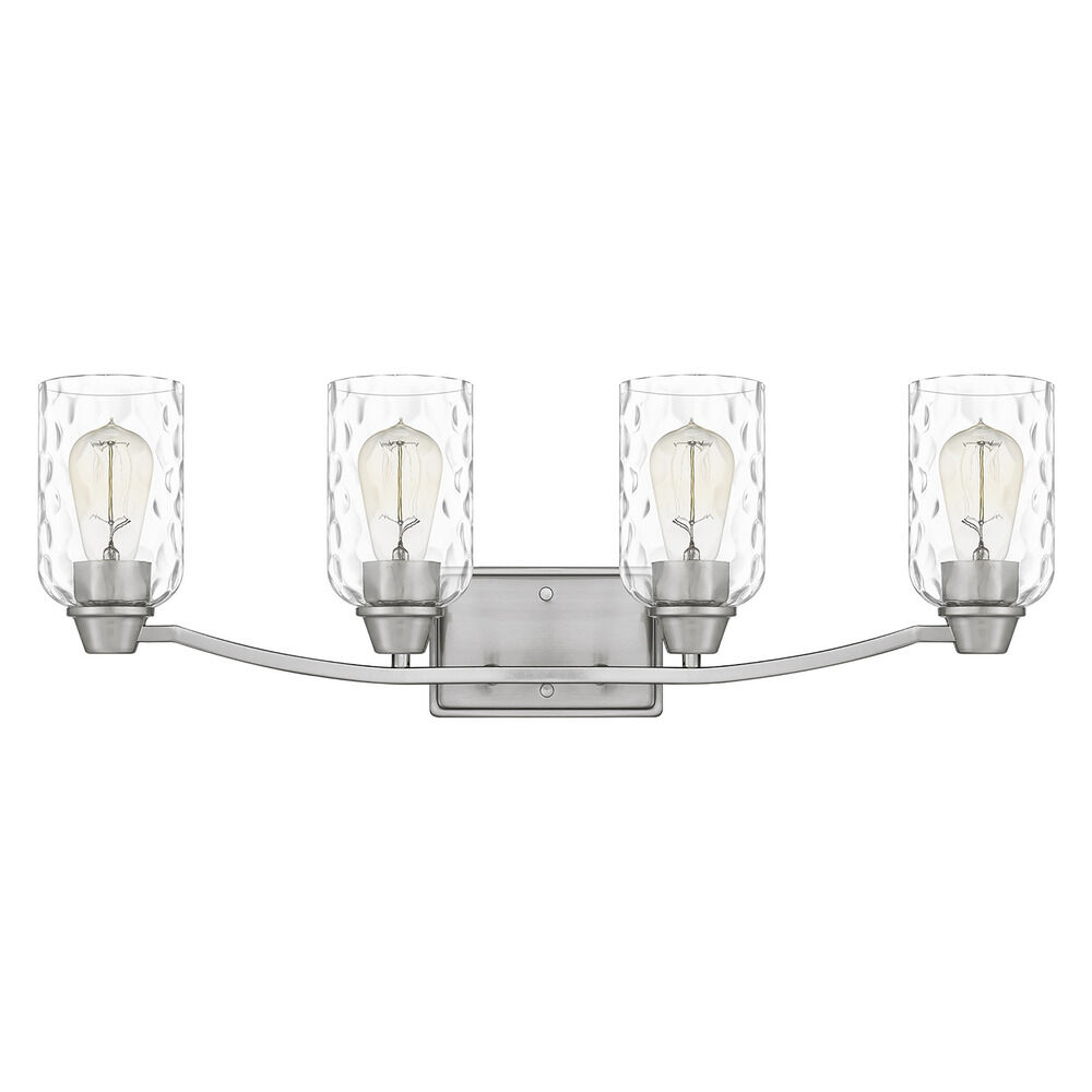 The Acacia Bath Light by Quoizel Lighting features a dappled Clear water glass, creating a serene sense of movement. This fixture also features a Brushed Nickel finish. Mount the Acacia in your bathroom or powder room for additional light and style.