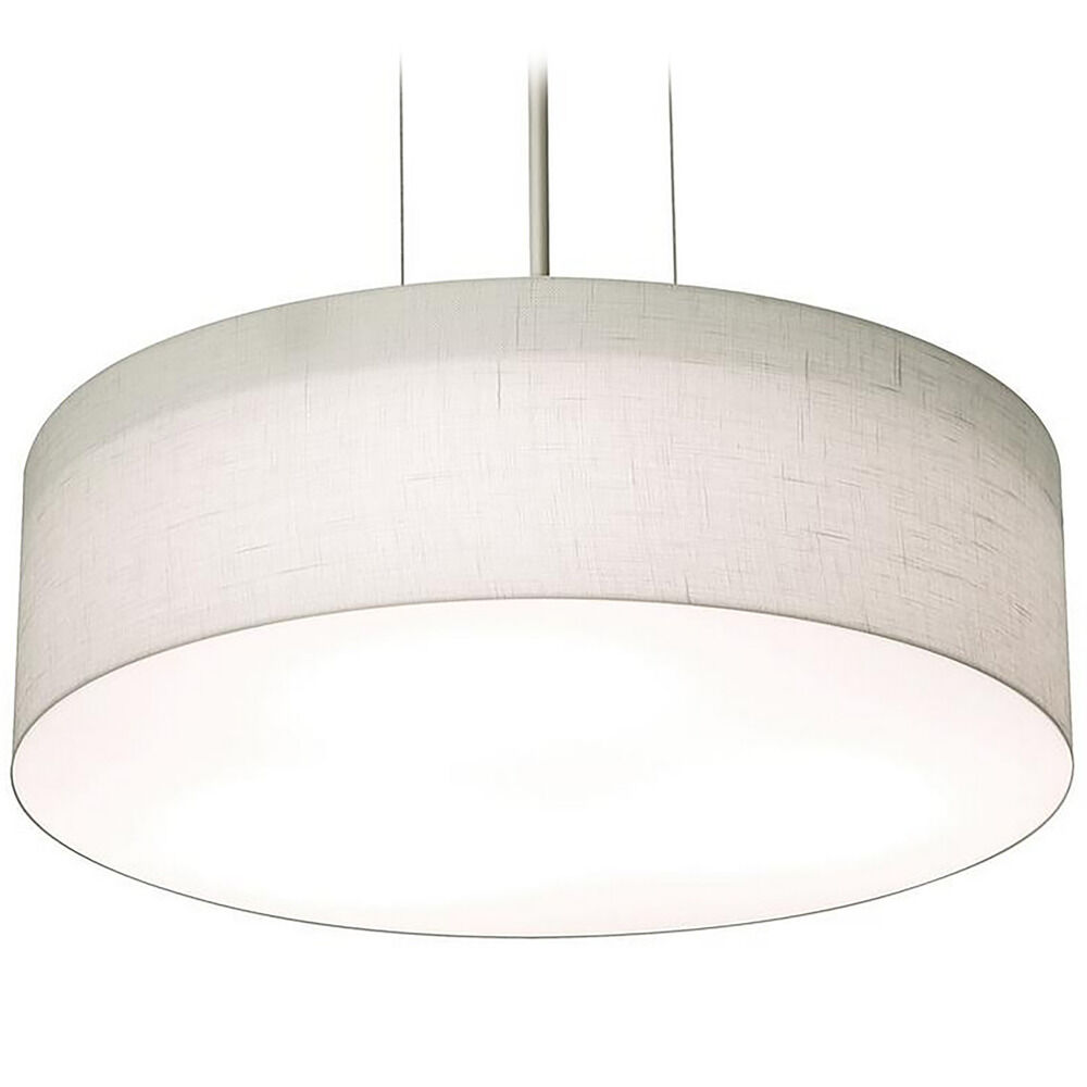 Modern single drum pendant fixture features LumaFuse laminated fabric/acrylic shade that is durable and easy to clean. White bottom acrylic diffuser disperses the light evenly. Available in five sizes, two canopy finishes and two shade finishes. Medium base lamping.