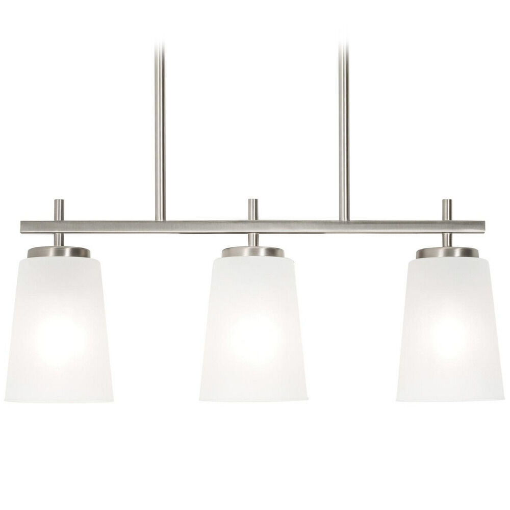Contemporary three light pendant with 5 ft. adjustable stem. Clear glass diffuser with black finish or white glass diffuser with satin nickel finish. Medium base sockets with 60W Max lamps (not included)
