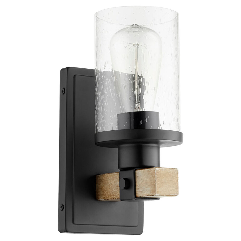 Farmhouse textured black & driftwood 1-light sconce with clear,seeded clear glass shade