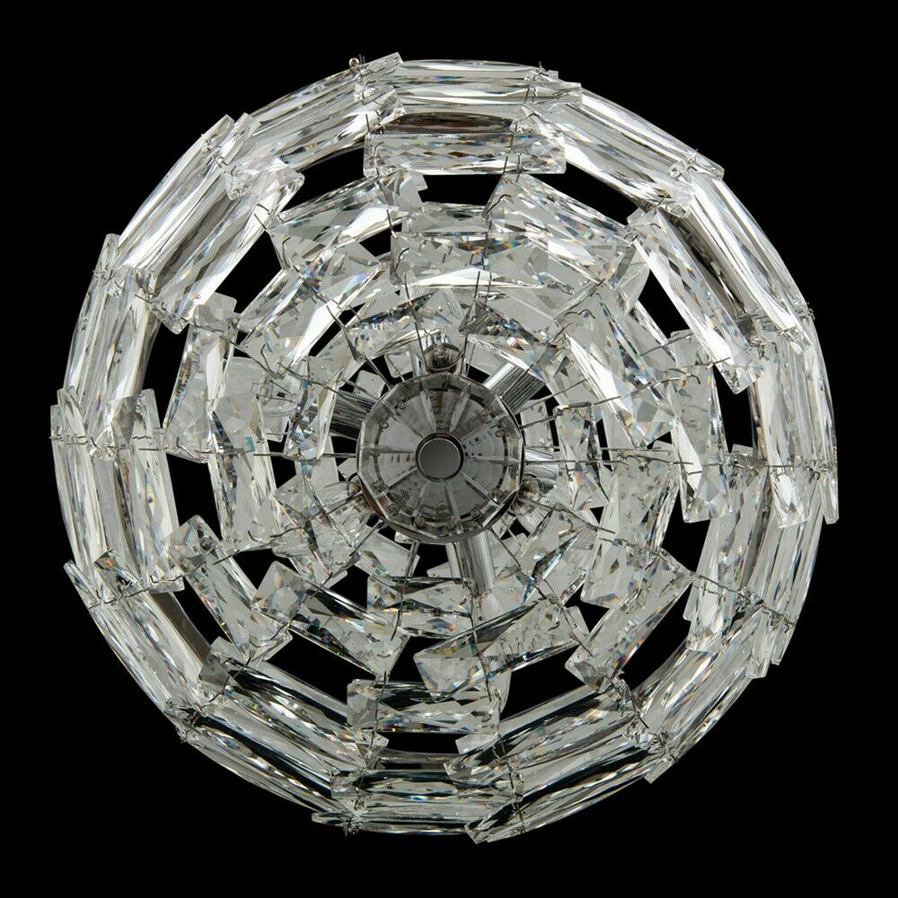 Housed within a polished chrome frame, a sputnik-inspired light cluster adds depth and dimension to the fixture, lending a contemporary layer of intrigue to its shimmering crystal form. Suspended by long adjustable wires and supported by a broad mounting plate, the pendant offers a dramatic presence with its generous overall dimensions, making it ideal for larger rooms where a striking centerpiece is desired.