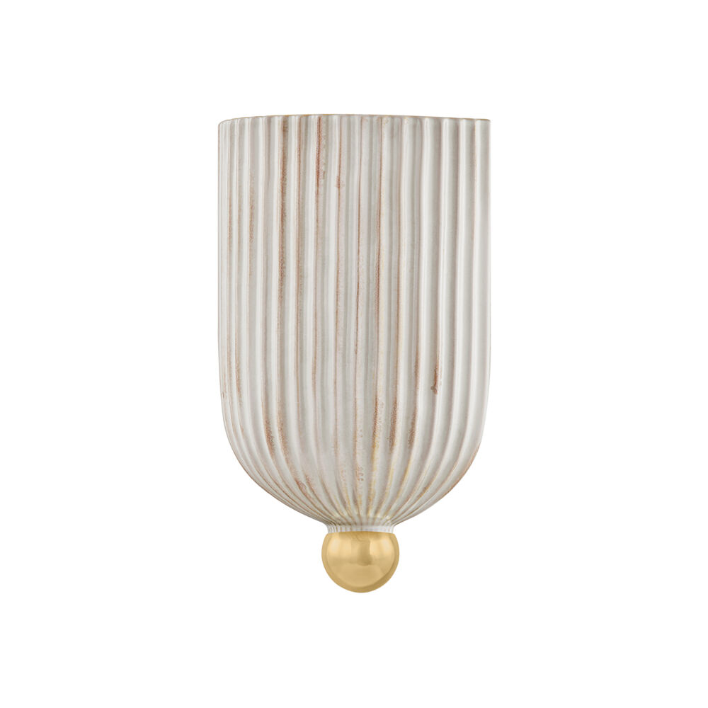 The Amira Wall Sconce in Aged Brass by Mitzi by Hudson Valley captures the timeless grace of classical architecture through a modern lens. Drawing inspiration from the fluted columns of ancient Greece, its vertically ribbed form introduces a neoclassical rhythm that feels both structured and serene. The matte white Fluted Cream ceramic glaze gently settles into each groove, revealing an earthy bisque undertone that enhances its handcrafted character. An ornamental sphere in Aged Brass crowns the design, adding a subtle metallic warmth that contrasts beautifully with the soft ceramic texture. Compact yet sculptural, the Amira sconce serves as a refined uplight that brings a calming, sophisticated glow to bathrooms, powder rooms, or intimate spaces seeking quiet elegance.