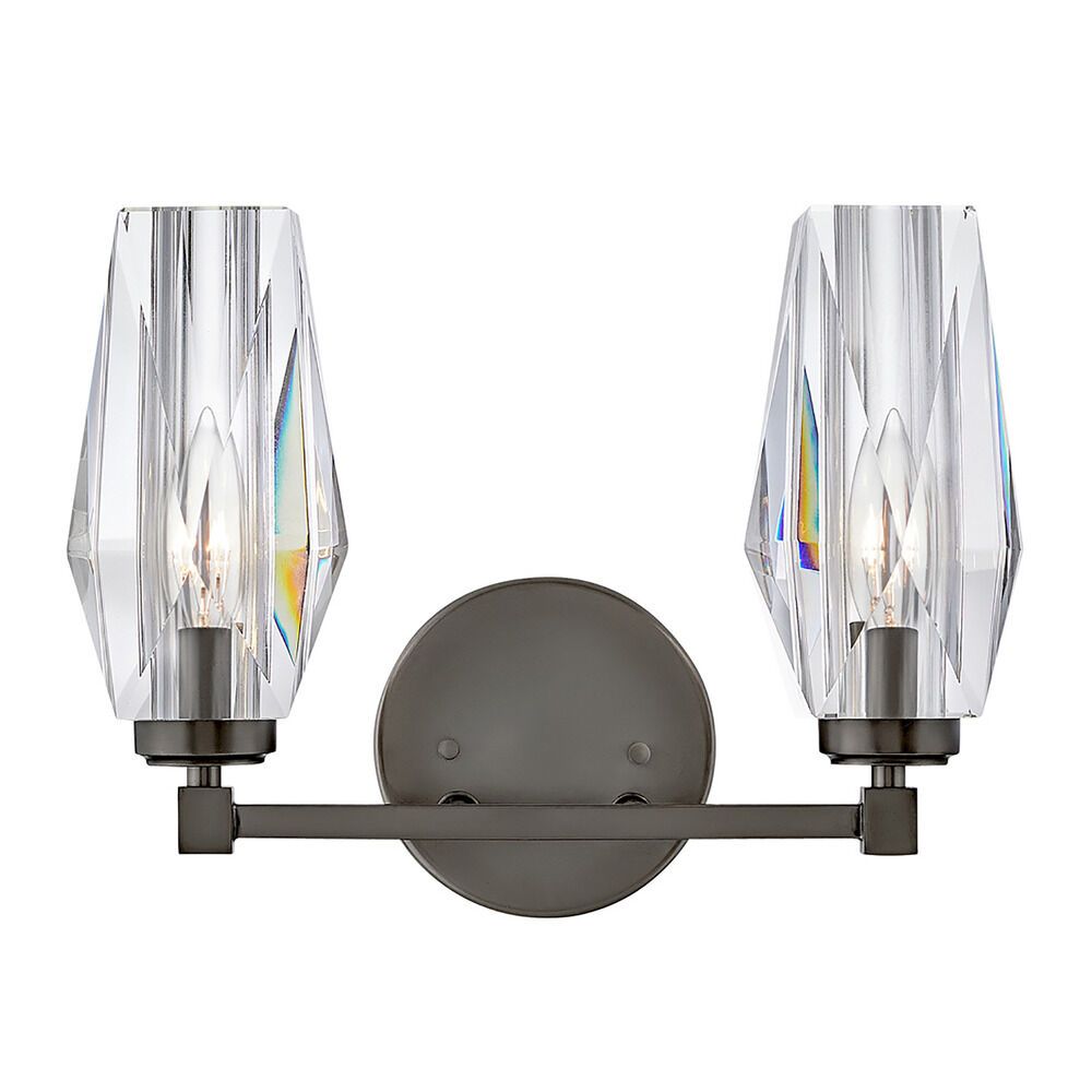 The Ana 2-Light Vanity Light by Hinkley Lighting is just the fixture to bring additional elegance and glam to your home. Perfectly suited for bathrooms and powder rooms, the Ana features a gorgeous Black Oxide finish. The Ana also features a clear faceted crystal glass. Two 60W maximum candelabra base light bulbs are required. Clear bulbs are recommended. This wall sconce is rated for Damp Location.