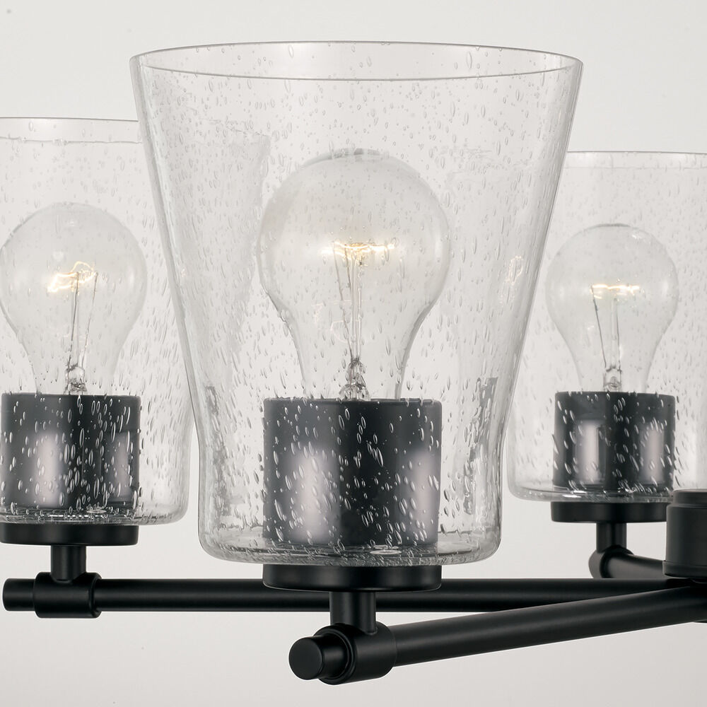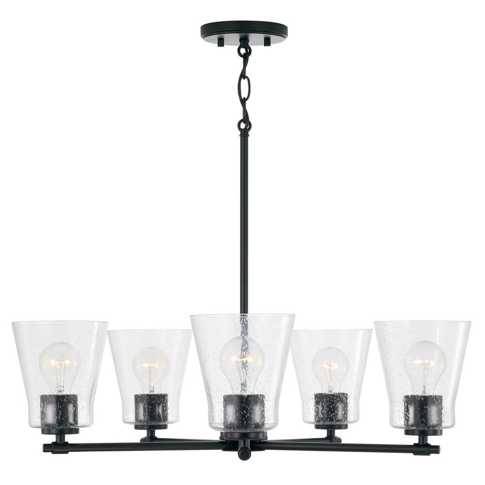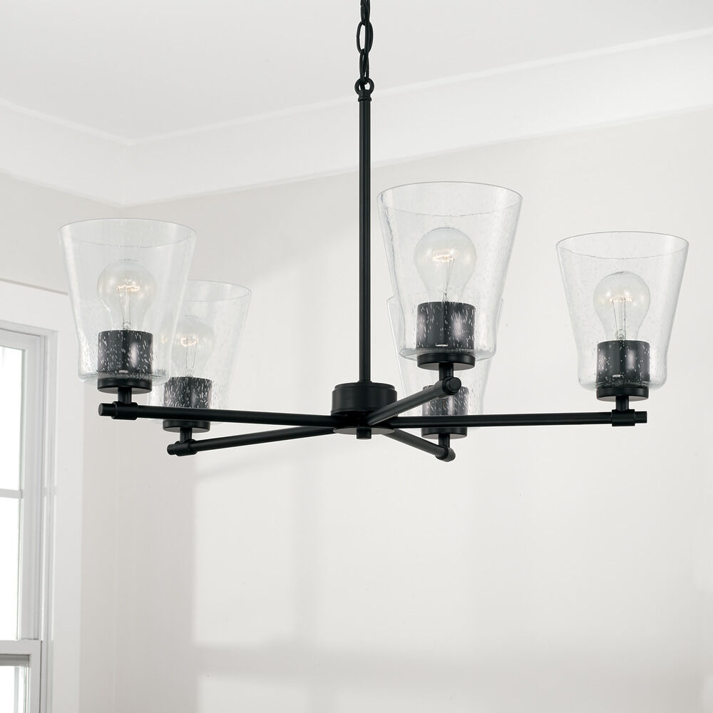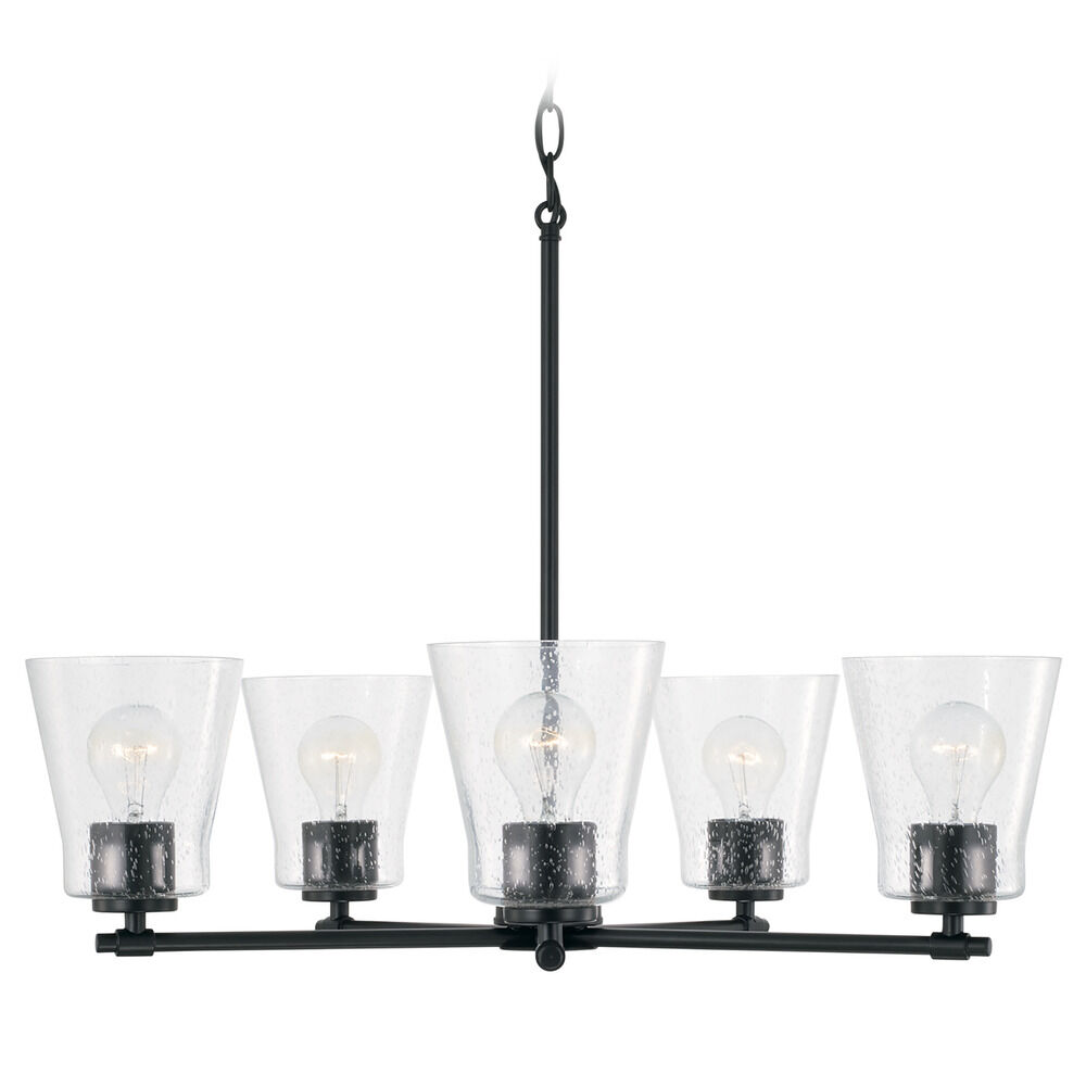 Brighten your dining room or nook area with HomePlace Lighting's Baker Chandelier. The Baker features a timeless Matte Black finish and Clear Seeded glass shades. This chandelier features a combination of rigid stems and chain, and requires five 100W maximum medium base A19 light bulbs. Clear bulbs are recommended. This fixture is rated for Dry Location only.