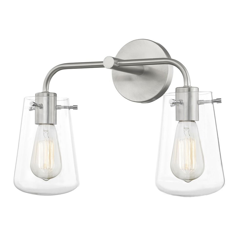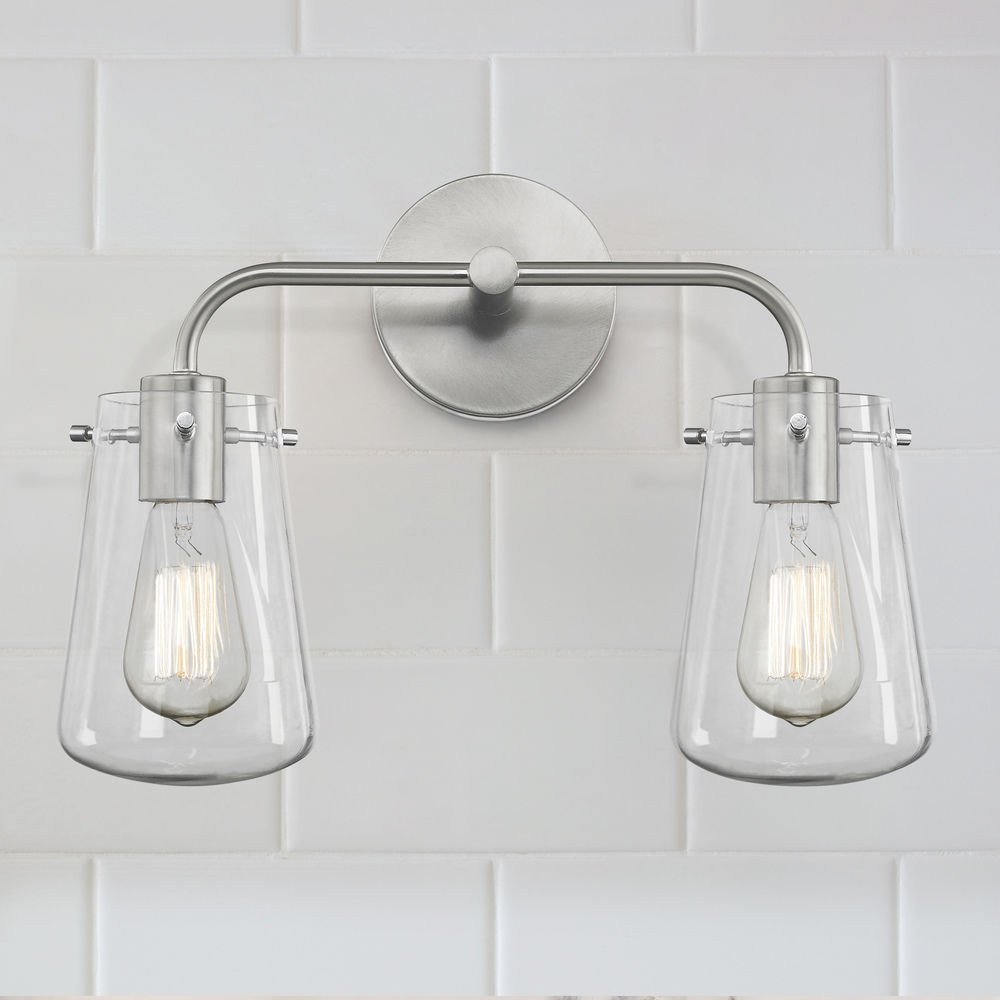 Vintage / retro / industrial satin nickel 2-light bathroom light with clear glass shade. Takes two 100-watt medium base carbon filament light bulbs (not included). Suitable for installation in dry and damp locations. This bathroom light can be installed with the glass facing down only. 120 volts line voltage. UL / CUL certified.