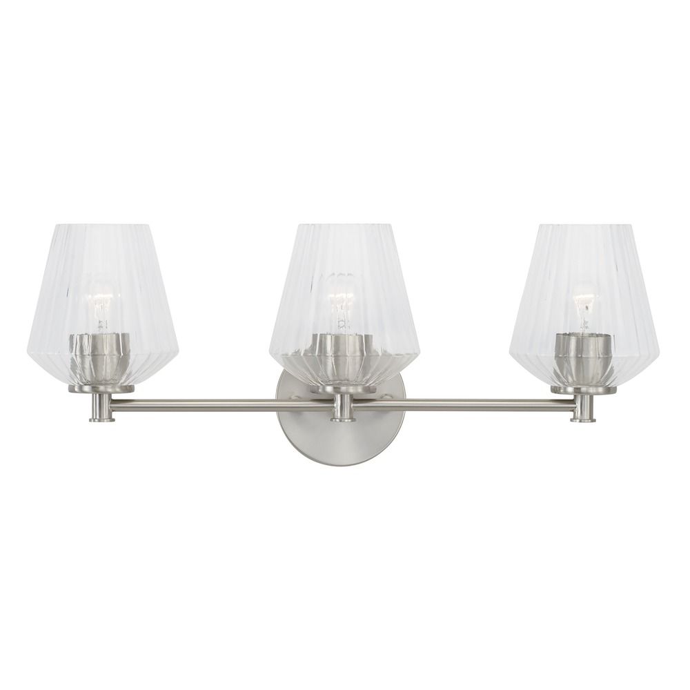 Transitional brushed nickel 3-light bathroom light with fluted clear glass shade