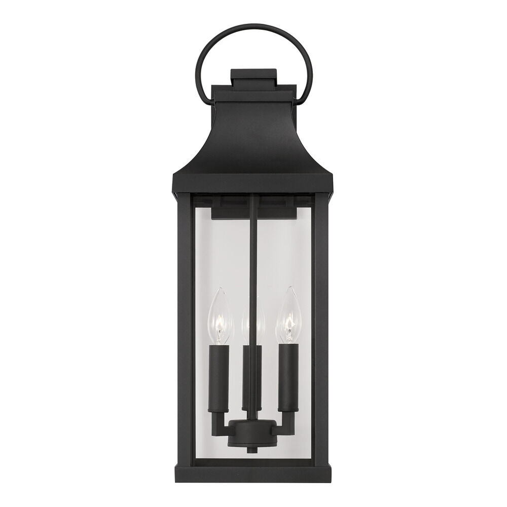 Illuminate the exterior of your home with Capital Lighting's Bradford Outdoor Wall Lantern. The Bradford features a rectangular frame in a Black finish, as well as Clear glass. A ring at the top of the fixture gives it its traditional Farmhouse look. The Bradford is open on the bottom for easy access to the bulbs, requiring three 60W maximum candelabra base light bulbs (not included). This fixture is rated for Wet Location.