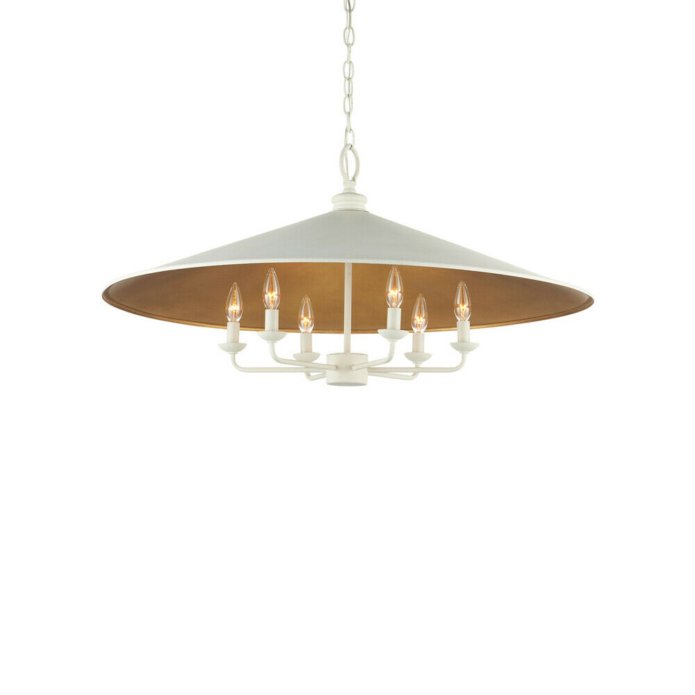 An Asian-inspired shade defines the sculptural presence of this chandelier, bringing a refined global sensibility to the space. Finished entirely in a crisp snow white, the exterior, arms, and hardware create a clean, tailored silhouette that feels both serene and architectural. Its balanced proportions and graceful form make it an elegant focal point over dining tables, living areas, or entryways.