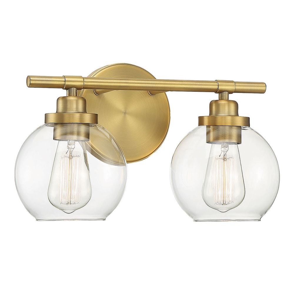 Mid-century modern warm brass 2-light bathroom light with clear glass shade