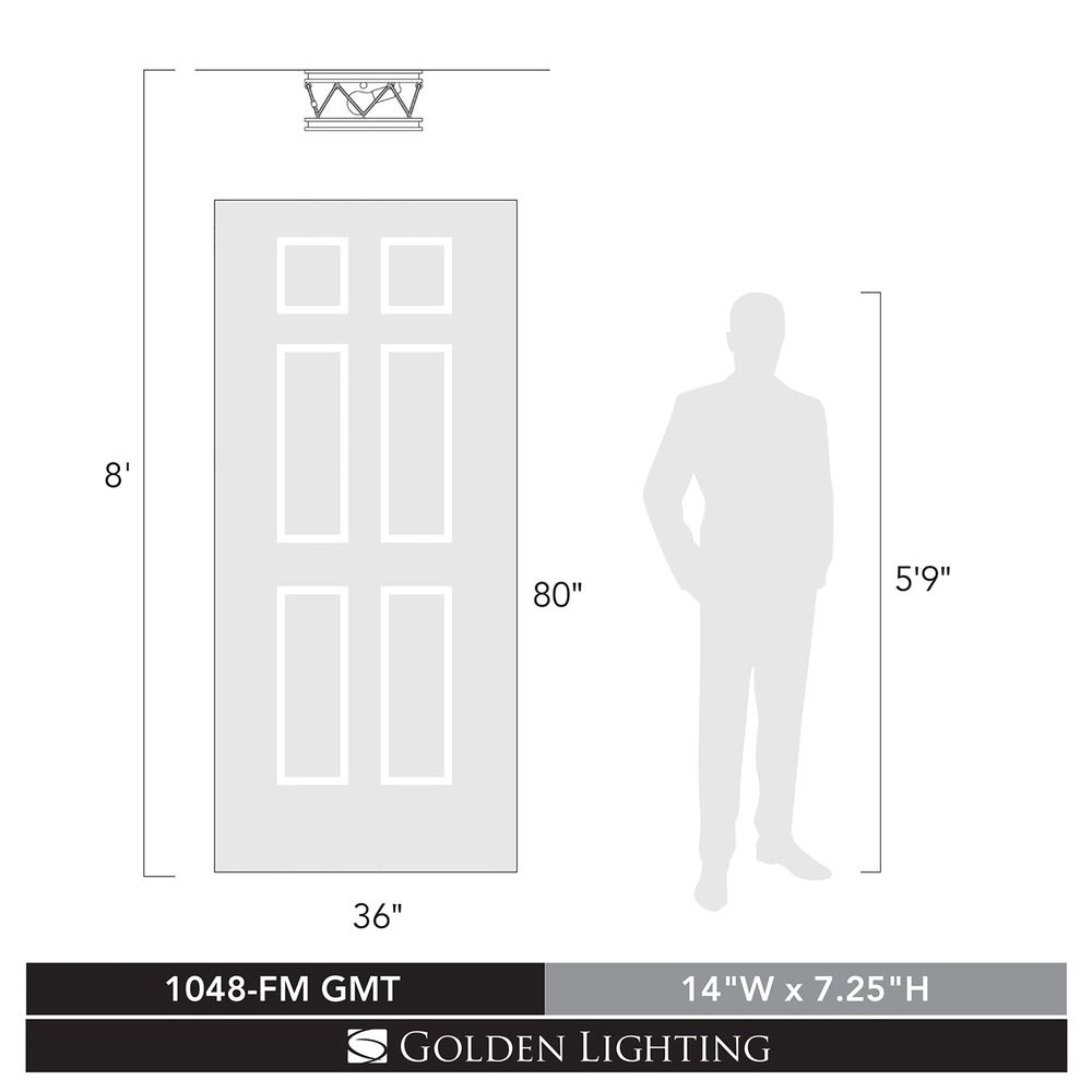 The following are detailed specifications about the Chatham 14-Inch Flush Mount in Gunmetal Bronze by Golden Lighting.