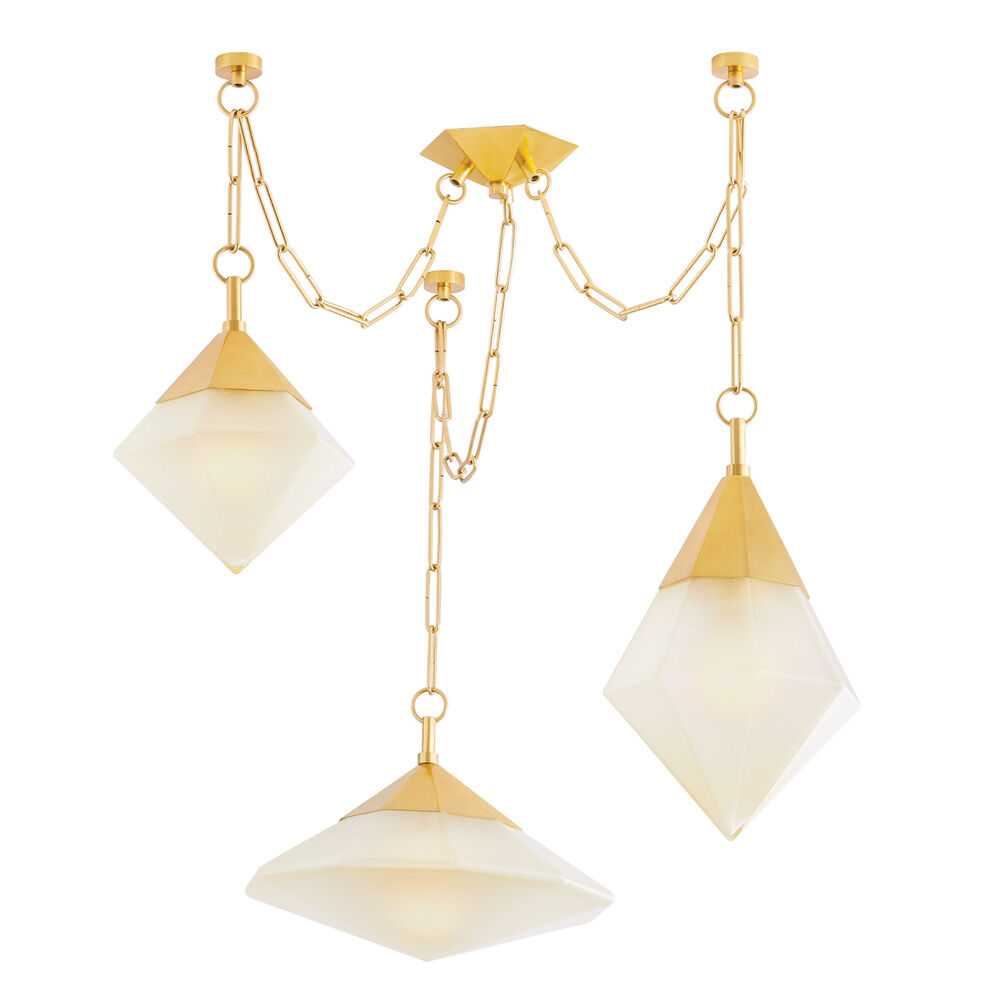 Inspired by the timeless allure of diamonds, Angelique features a cluster of geometric pendant lights with sparkling seeded glass facets. Suspended from a Vintage Brass chandelier, each pendant glows on a different level to create a luxe visual display overhead. The distinctive hand-blown glass bubbles resemble raindrops when the fixture is lit. Available in two sizes, Angelique brings an element of mysticism to interior design.