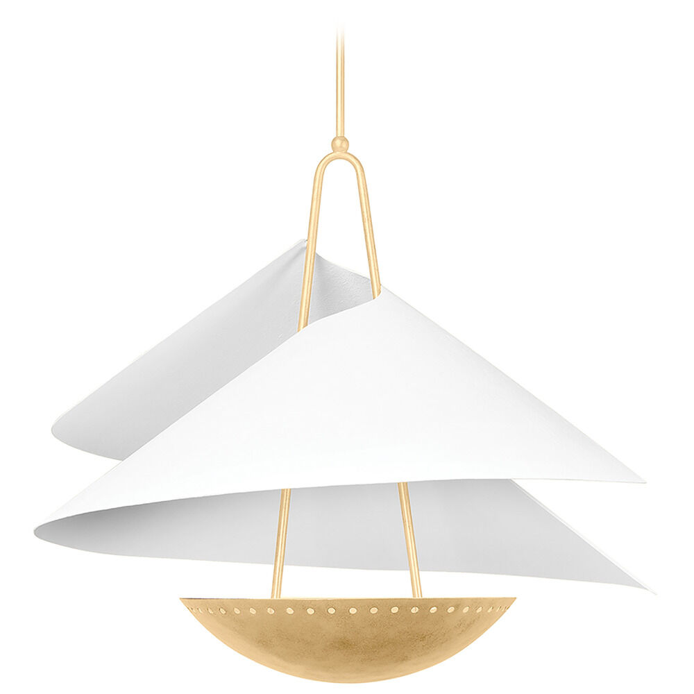 A billowy, abstract form in Gesso White flows over a Vintage Gold Leaf bowl to create a whimsical, yet sophisticated silhouette. Carini's airy, wave-like form gives the pendant a sense of motion. The perforations and unique shape cast beautiful reflections onto the ceiling above.