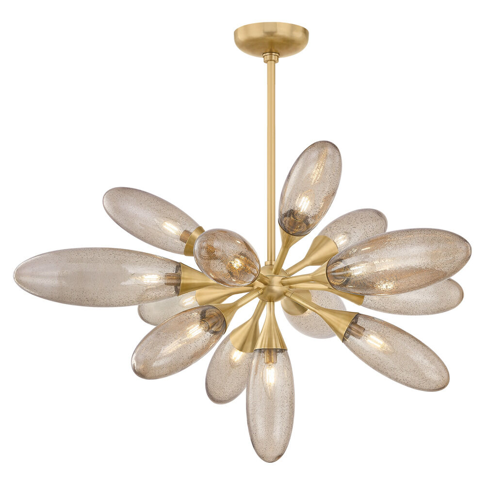 Organic forms and surprising geometry come together in the bold Sputnik-inspired design of Cordoba. This family of fixtures features an array of seedy light bronze glass shades that are light yet voluminous, organic yet refined. The Vintage Brass finish on the frame gives Cordoba a retro flair, while the futuristic shape of the glass shades adds a contemporary edge. Available as a sconce, semi-flush mount, and chandelier in two sizes, Cordoba is perfect for adding a dramatic, sculptural moment.