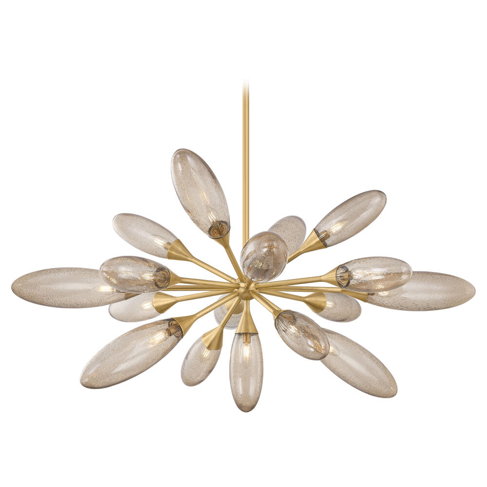 Organic forms and surprising geometry come together in the bold Sputnik-inspired design of Cordoba. This family of fixtures features an array of seedy light bronze glass shades that are light yet voluminous, organic yet refined. The Vintage Brass finish on the frame gives Cordoba a retro flair, while the futuristic shape of the glass shades adds a contemporary edge. Available as a sconce, semi-flush mount, and chandelier in two sizes, Cordoba is perfect for adding a dramatic, sculptural moment.