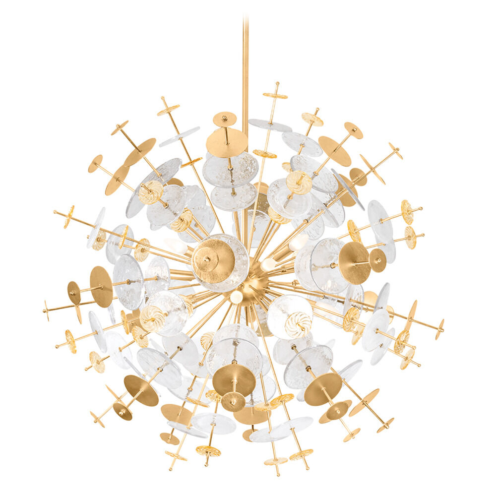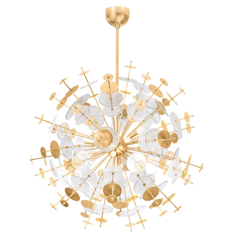 More than a chandelier, Gleason is a contemporary work of art. With a futuristic Sputnik design, it features a burst of Vintage Gold Leaf spokes adorned with decorative cast glass and gold discs. The interplay between reflection, refraction, and transparency creates a compelling display of light. Available in two sizes, it provides a compelling statement piece.