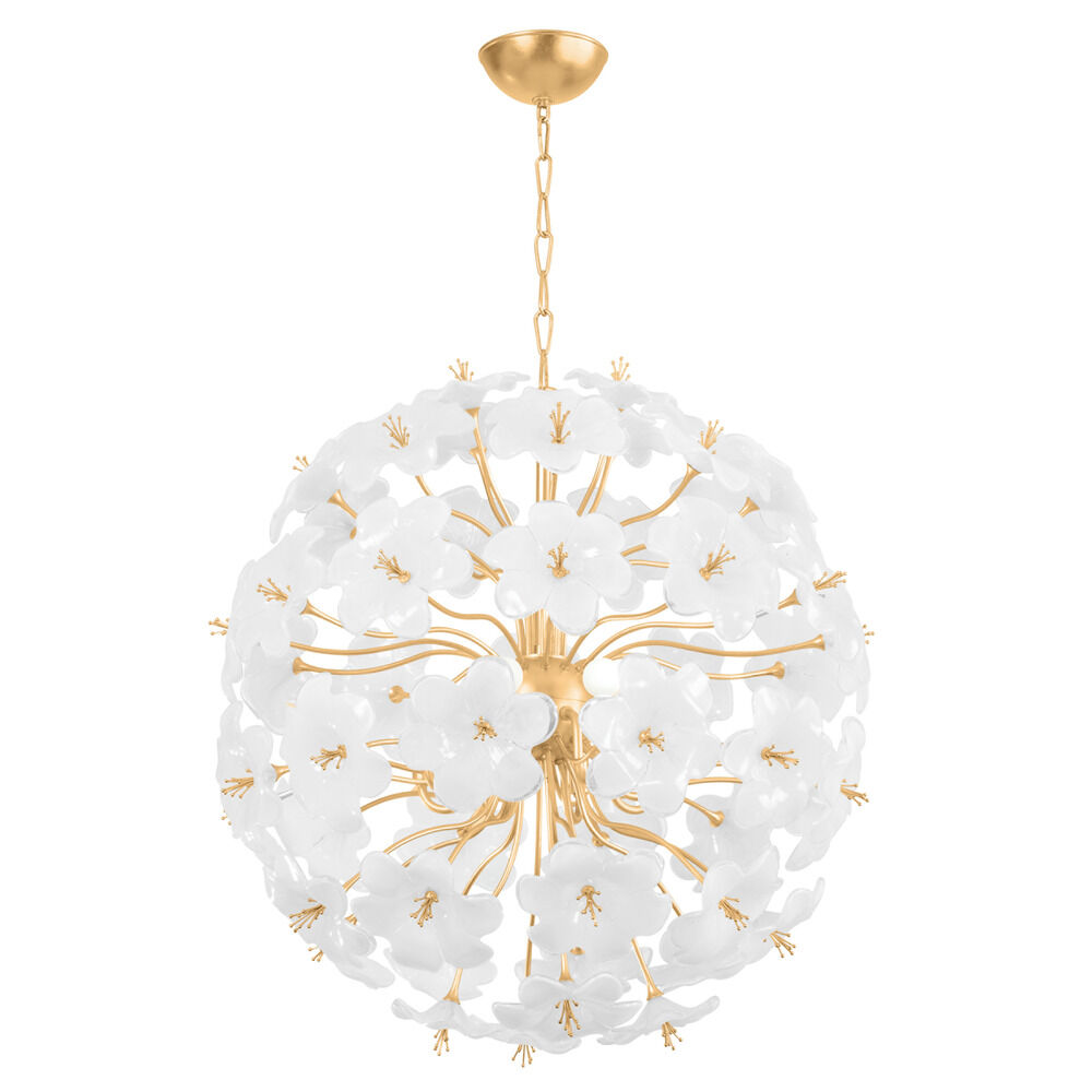 An airy spray of white glass flowers forms the cloud-like silhouette of Hygea. Gold Leaf arms act as stems, supporting the delicate blooms as they gently diffuse light. Available as a wall sconce, flush mount, or chandelier in two sizes, Hygea casts a bright glow over modern interiors.