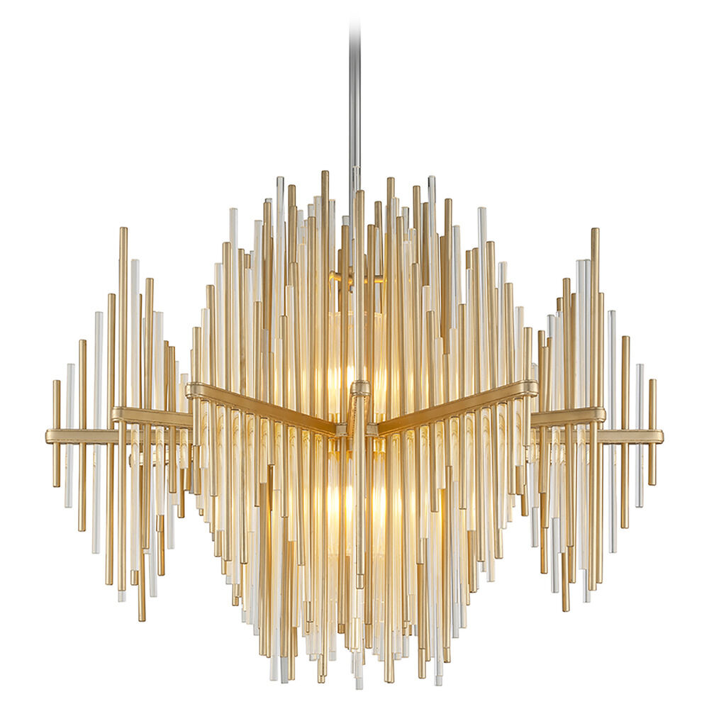 Add modern sophistication and striking architectural style with the Corbett Lighting Theory 2-Light Chandelier in a luxurious Gold Leaf and Polished Stainless finish. Featuring two E26 medium-base sockets (bulbs not included) and clear glass rod accents, this substantial 40-inch diameter by 32.75-inch height fixture delivers balanced ambient illumination ideal for foyers, dining rooms, living areas, and great rooms.