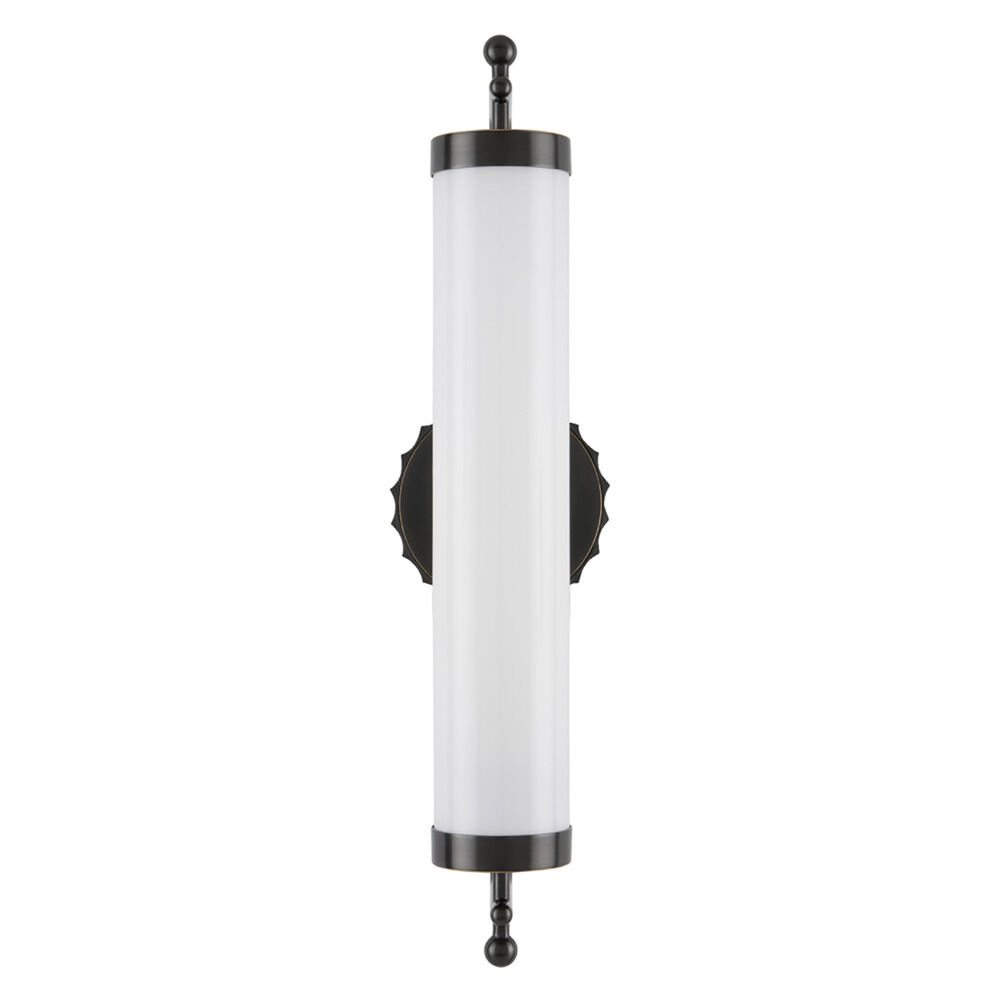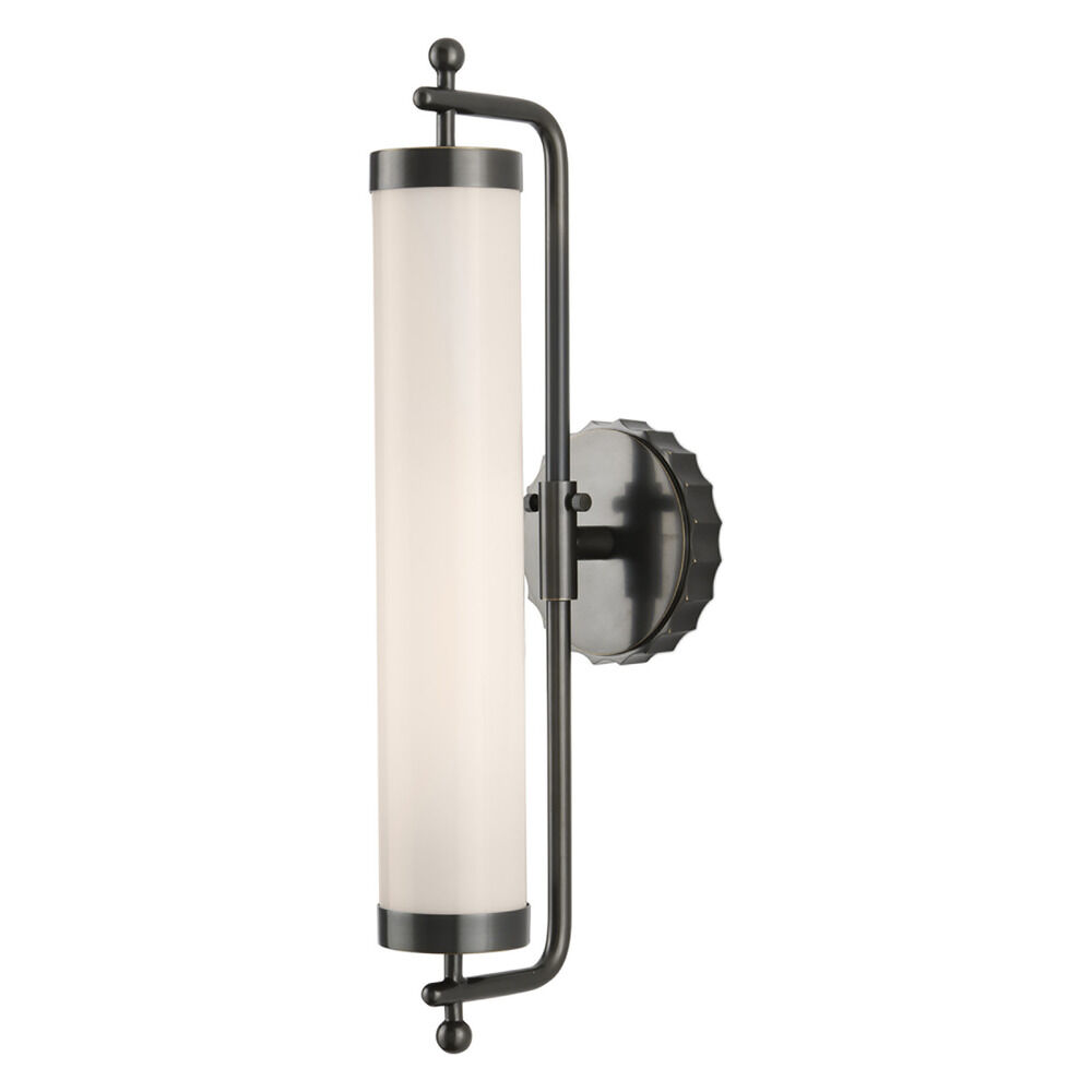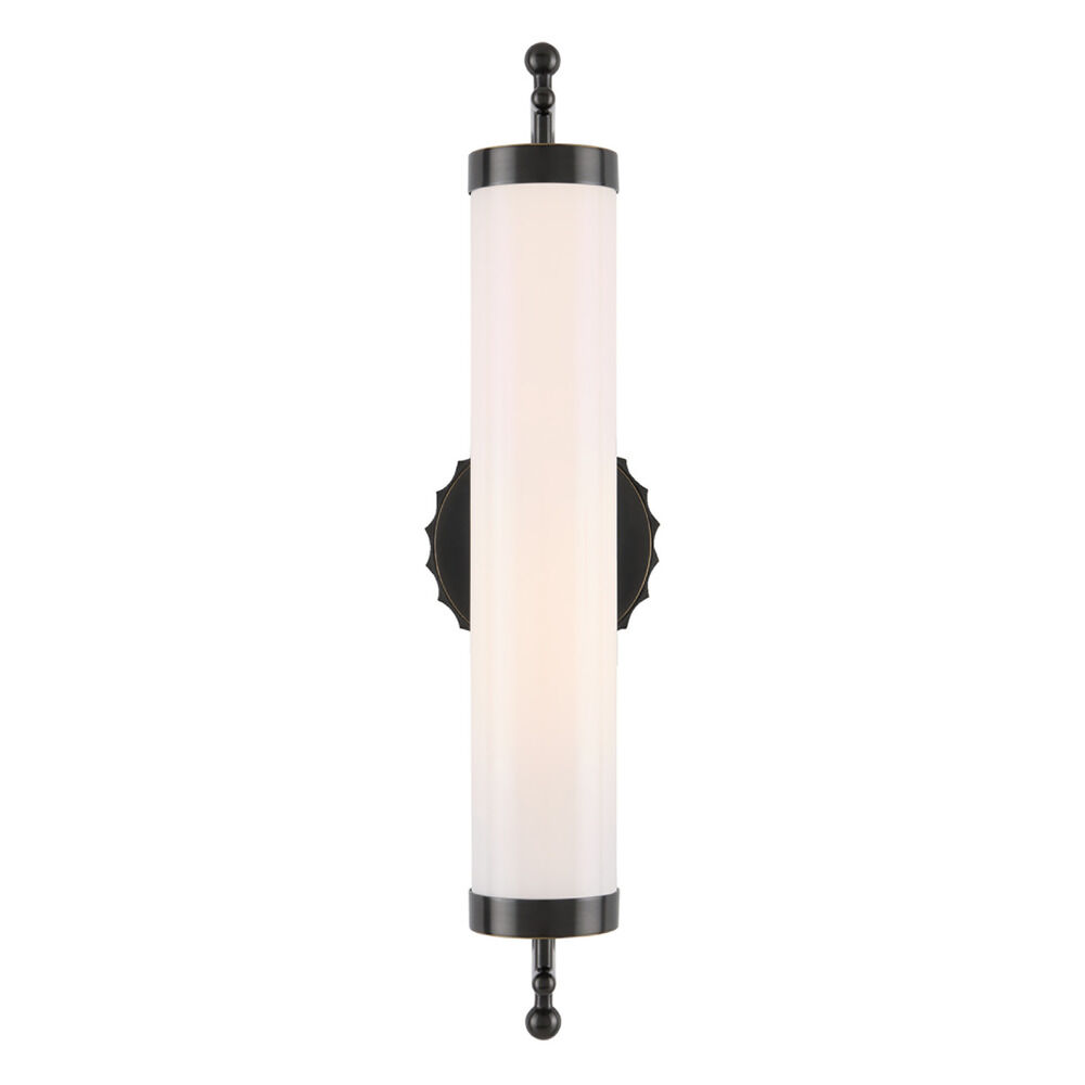 The Latimer Bronze Wall Sconce in the Barry Goralnick Collection is made of metal in an oil-rubbed bronze finish and a tubular milk-glass shade. This black sconce is certified for damp locations and can be installed horizontally or vertically. This thoughtful aspect of the design is not a surprise given Goralnick is an architect and his creations tend to be engineered at the highest levels of specificity.