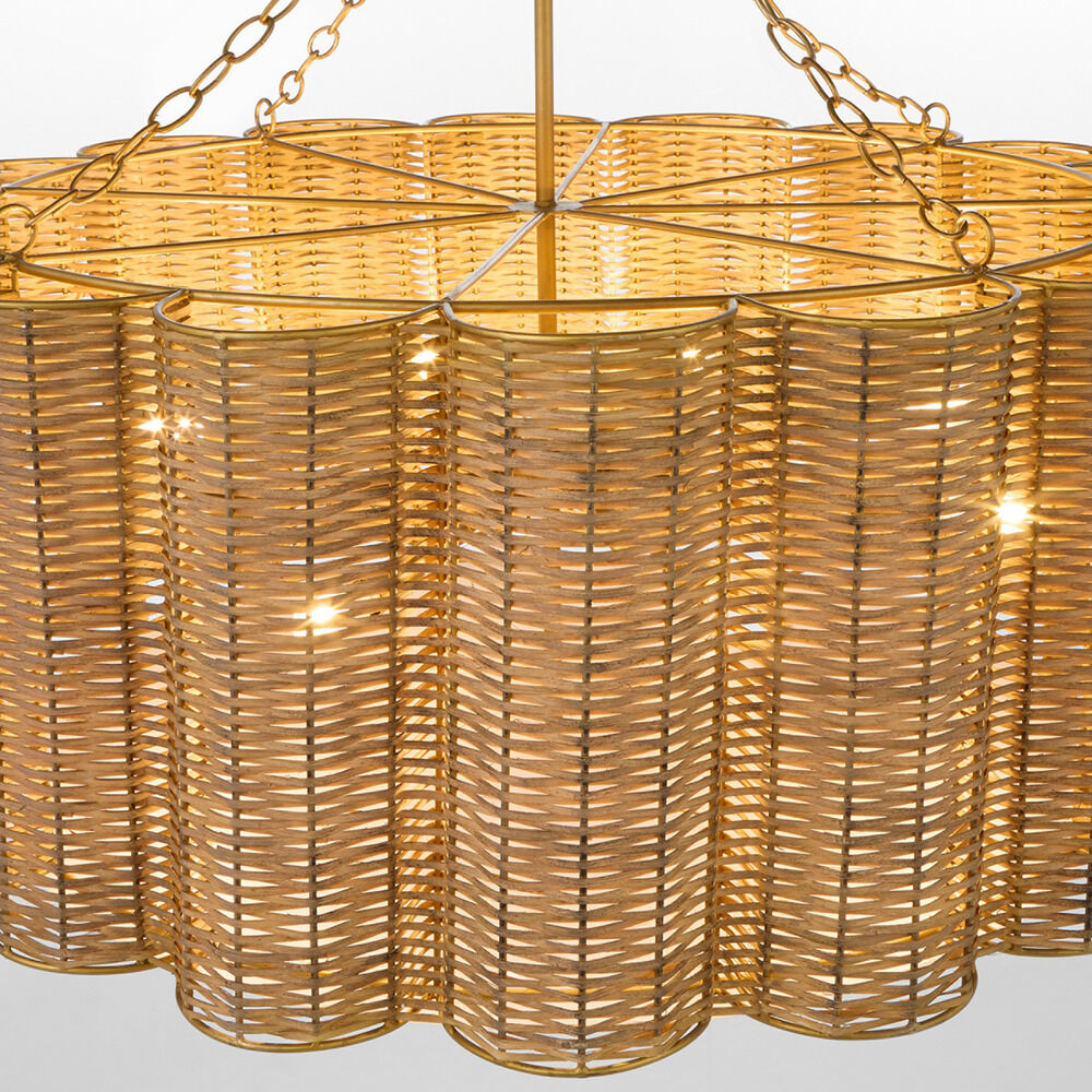 The Boraclay chandeliers have shades crafted from woven rattan and shaped into a scalloped, floral pattern, giving the collection the essence of a coastal resort. The natural texture and warm tones of the cane create a cozy and inviting atmosphere. Inside the structure, multiple medium base sockets provide soft, ambient lighting. The damp-listed chandeliers are suspended from the ceiling by an adjustable chain and matching rod, adding versatility to the overall design. This piece combines rustic materials with familiar forms, making it an ideal choice for adding a statement to any room with a blend of natural and modern elements. Available in two finish options.