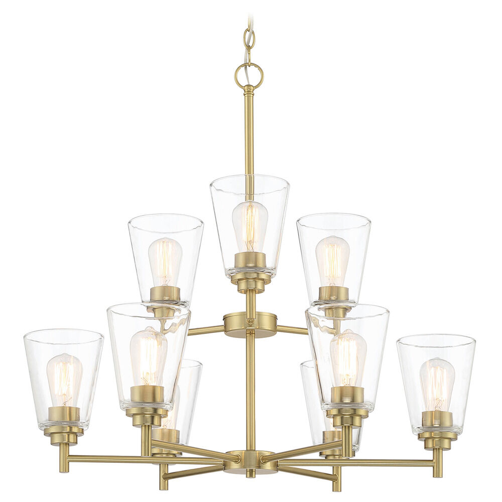 Contemporary / modern brushed gold 9-light chandelier with clear glass shade