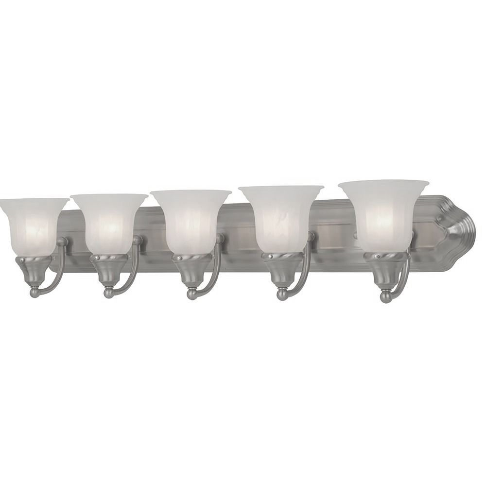 This attractive bathroom fixture measures 36 inches in length and boasts five alabaster-glass bells, each supported by an ornamental arm. A lustrous satin-nickel finish and decorative trim add to the character of the piece. This is a wonderful choice for lighting a bathroom vanity area. Can be mounted with the shades facing up or down. Takes five 100-watt medium base frosted light bulbs (not included). Suitable for installation in dry locations only. 120 volts line voltage. UL / CUL certified.