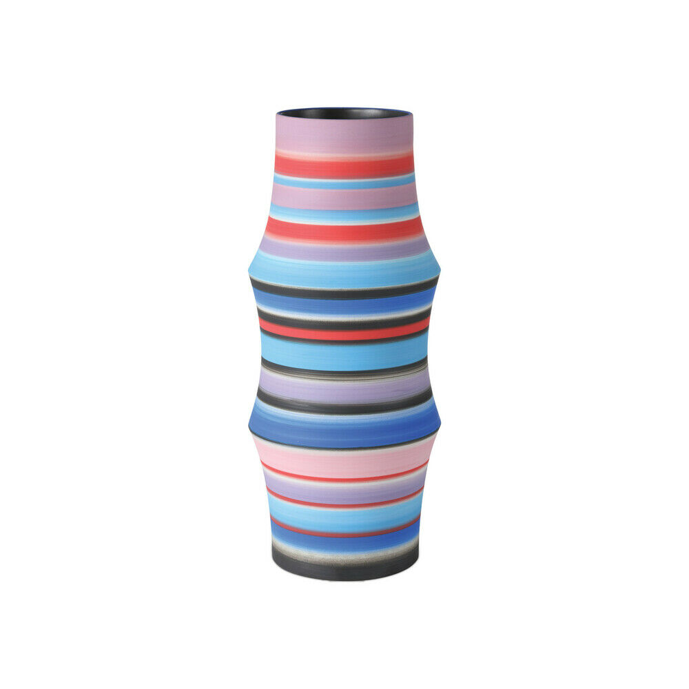 The Happy 80s Large Bright Blue and Red Vase is a bold celebration of color and craftsmanship, capturing the playful energy of the 1980s with a modern sensibility. Hand-thrown from porcelain, the oversized form is wrapped in vivid striations of brilliant blue and lively red that create a dynamic, eye-catching surface.