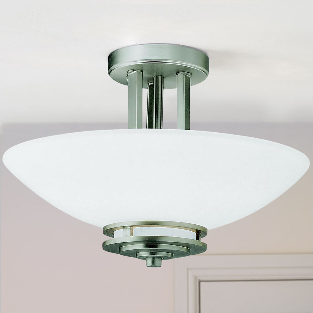 This Kichler brushed nickel semi-flushmount ceiling light combines steel and glass to create a durable yet modern look. This fixture is perfect as a main light in the hallway or in a kitchen as the satin-etched shade emits a soft white glow. Alternatively, this product can also be used as a transitional light or a study light to create a focused lighting effect. This contemporary piece from the Hendrik collection requires two medium-base A19 incandescent light bulbs of up to 60-watts each.