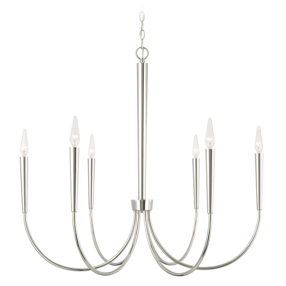 Light up your space with Capital Lighting's Holden Chandelier. This classic chandelier features swooping arms in a Polished Nickel finish, with tapered candle sleeves at the ends. The Holden includes 120 inches of chain and requires six 60W maximum candelabra base light bulbs. This chandelier is rated for Dry Location.