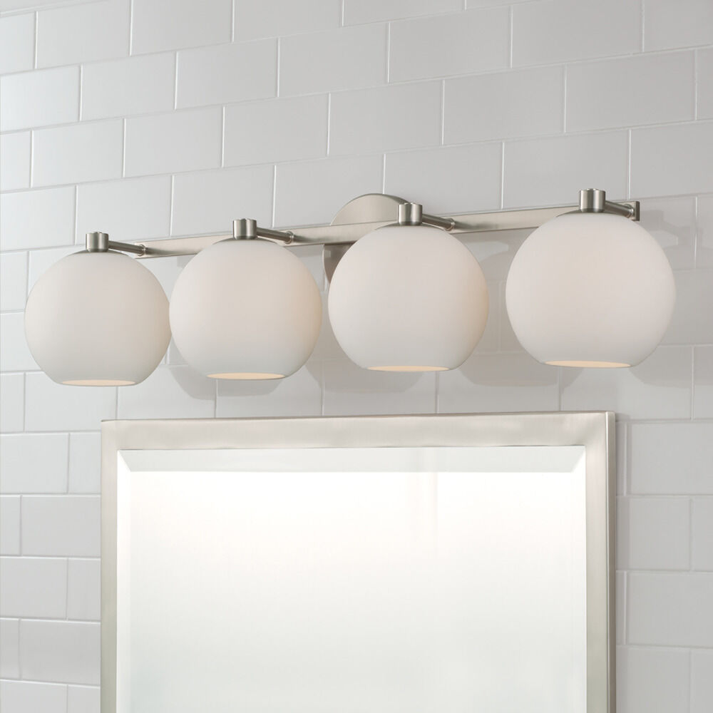 Mid-century modern brushed nickel 4-light bathroom light with soft white glass shade