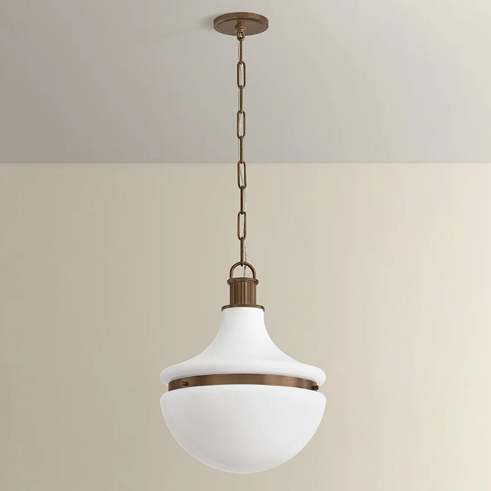 The Barryville pendant filters historical design inspiration through a contemporary lens. Paying homage to the work of Peter Behrens, it features an antique silhouette reimagined for today. The Heritage Bronze metalwork pairs beautifully with the shiny opal glass shade. Details like the architectural fluted socket cups, decorative top loop, and uniform chain root Barryville in this century. Comes as one light available in two sizes.