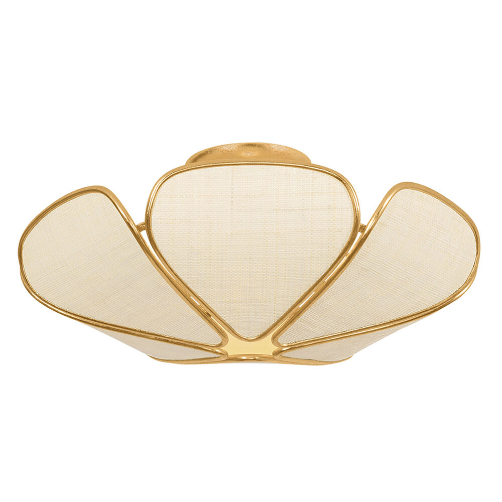 Inspired by Art Nouveau designs, the Bayville family uses natural materials to create flowing botanical silhouettes. The breezy Saguran fabric shade is constructed of petal-like panels edged in Vintage Gold Leaf and lined with abaca. Available as a semi-flush and a pendant in two sizes, Bayville will breathe new life into any space. Due to the one-of-a-kind nature of the medium, exact colors and patterns may vary slightly from the image shown.