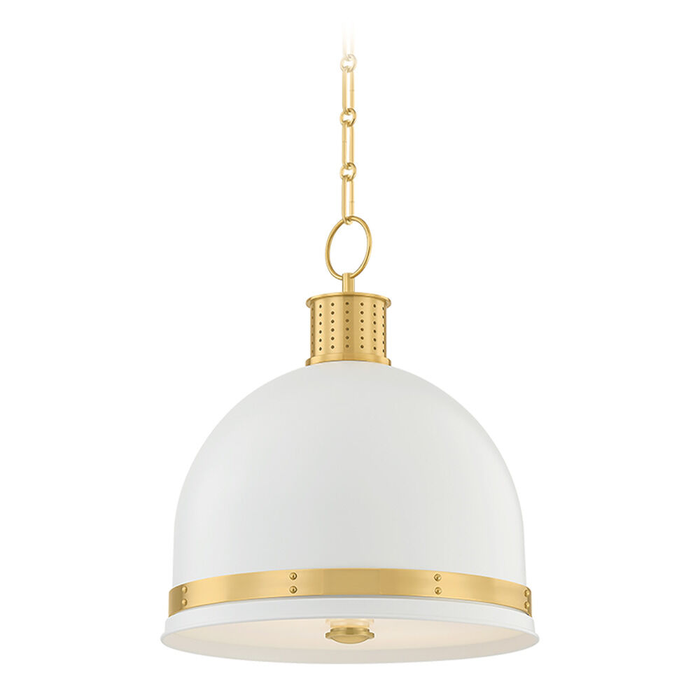 The Briscoe pendant updates a modern RLM silhouette with edgy details and a bright finish. Painted in a matte Soft White with a white glass bottom diffuser, the dome shade is suspended by an Aged Brass chain, decorative band, and hardware. Machine-cut perforations and studs add a bold accent to the design. Available in two sizes, this versatile staple energizes kitchens, dining spaces, and entryways.