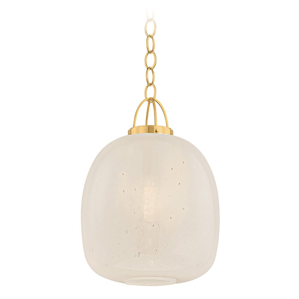 The Enosberg pendant pairs a soft organic shape with novelty metalwork. An oblong cloud seedy glass shade is supported by a cage-like suspension and chain finished in Aged Brass. The bubbling of the glass attracts the eye with its subtle, energetic texture. Available in two sizes, Enosberg makes a compelling statement over a dining table or when grouped above a kitchen island.