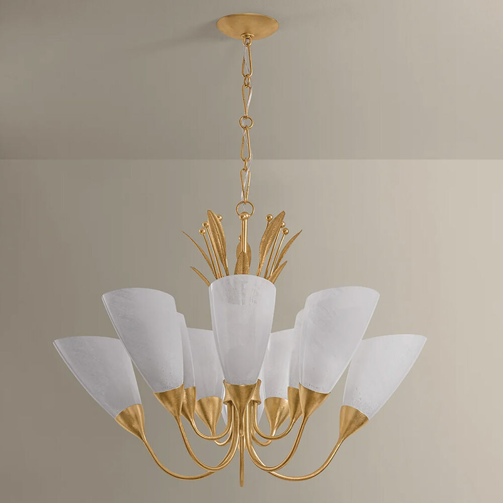 Cloud seedy glass shades bloom around a bouquet of decorative 'leaves' in the poetic Forest Glen family. Finished in Vintage Gold Leaf, the frame is elevated by hand-etched details, creating organic veining that looks true to nature. Available as a wall sconce, 6-light chandelier, and 10-light chandelier, Forest Glen creates an inviting lighting experience wherever it is placed.