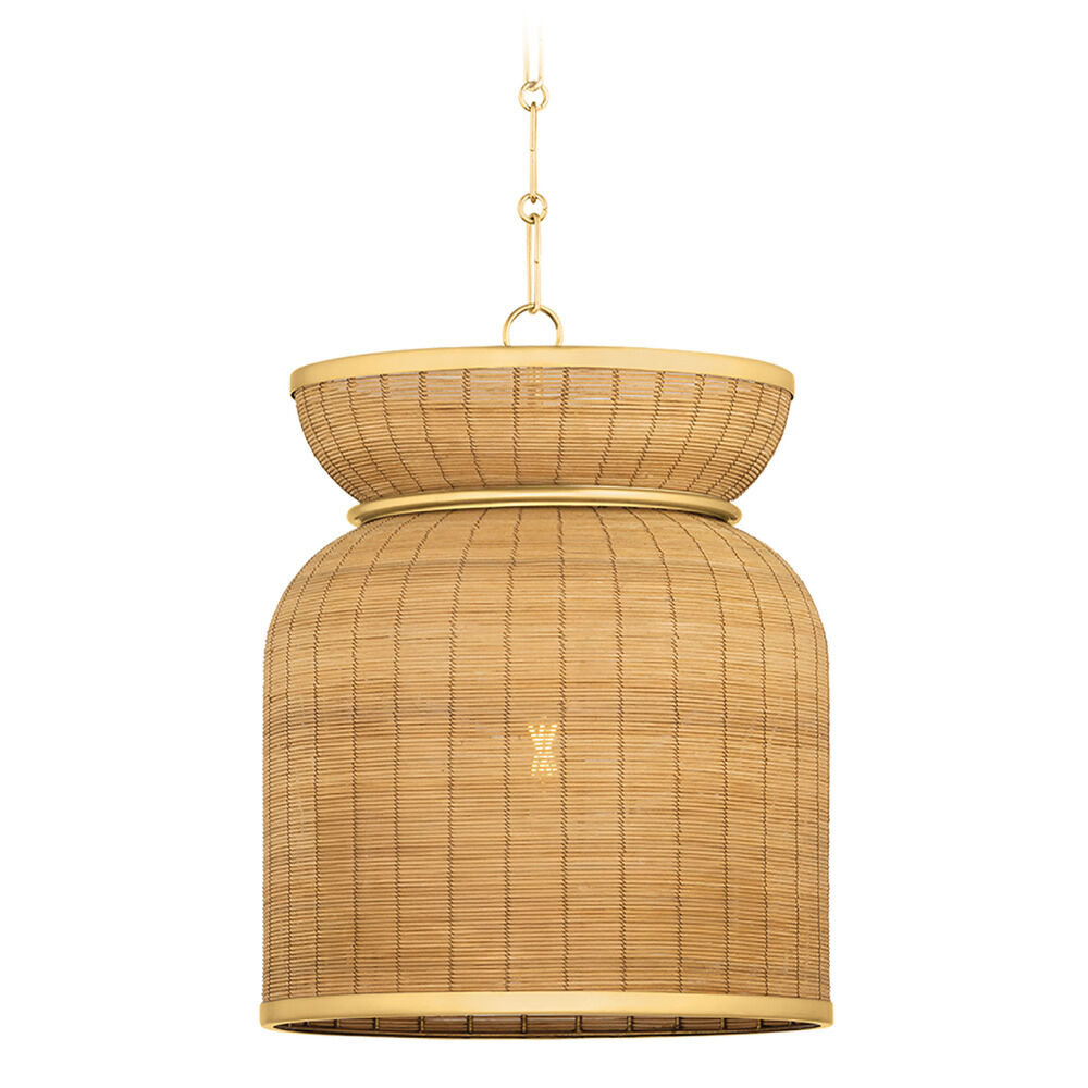 Handcrafted in India, the basket-inspired weave of the Parkchester pendant highlights the special qualities of natural rattan. Adding a note of shine to the construction, an Aged Brass band cinches the fixture at the top, coordinating with the chunky chain suspension. Available in two sizes, Parkchester filters the light to beautiful effect. Due to the one-of-a-kind nature of the medium, exact colors and patterns may vary slightly from the image shown.
