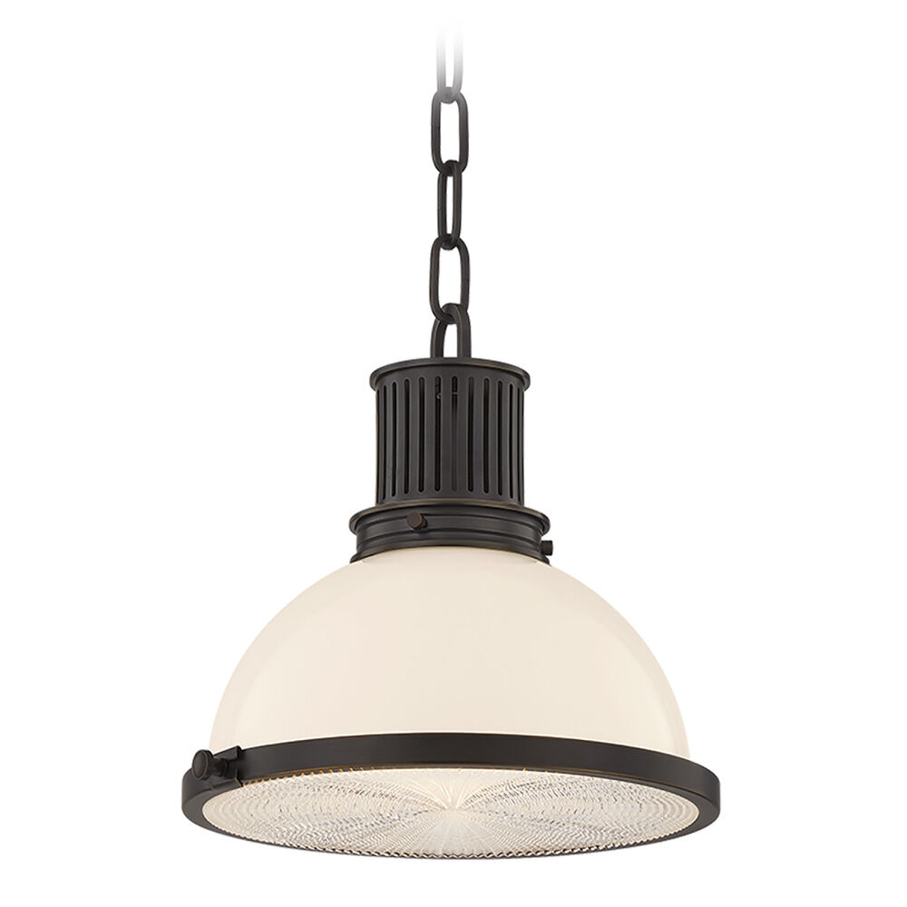 The retro-inspired Pinesbridge takes a classic RLM silhouette and reimagines it with geometric details. A large opal shiny glass shade is paired with a mesmerizing holophane glass diffuser featuring textural grooves. Machine-cut perforations around the top of the pendant add an industrial edge. Available in two sizes and finished in either Aged Brass or Distressed Bronze, this schoolhouse lamp revamp hangs with style in kitchens, hallways, and beyond.