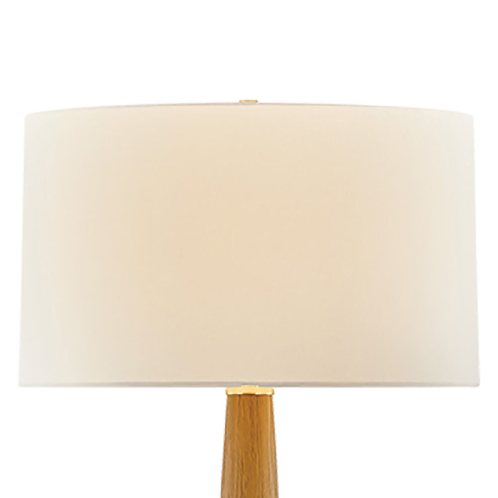 Streamlined and statuesque, the mid-century silhouette of the Somers Chase floor lamp has been hand-carved from natural wood. The light oak base tapers inwards at the middle, creating a point of interest. A large crisp white linen drum shade complements the wood, while an Aged Brass finish on the hardware adds an element of shine at the base. Due to the one-of-a-kind nature of the medium, exact colors and patterns may vary slightly from the image shown.