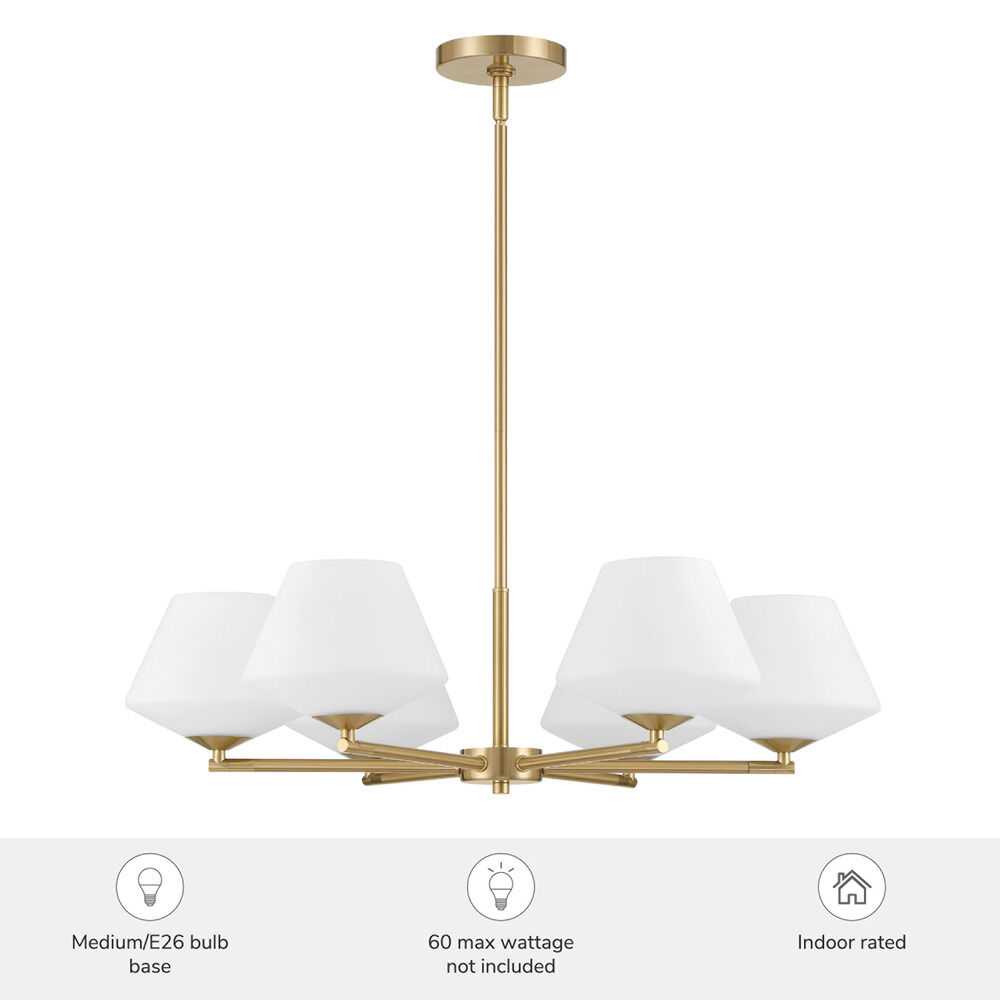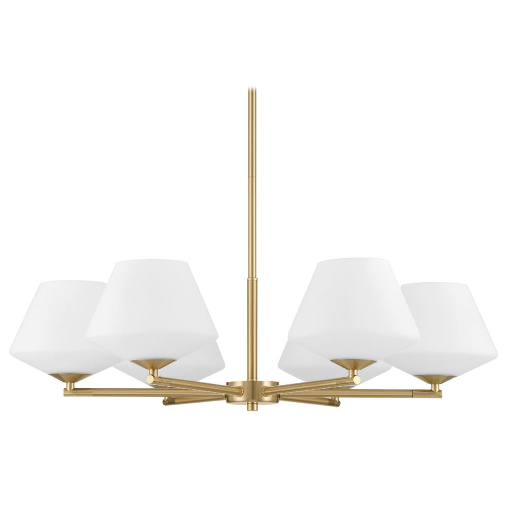 Mid-century modern alturas gold 6-light chandelier with matte,cased cased white glass shade