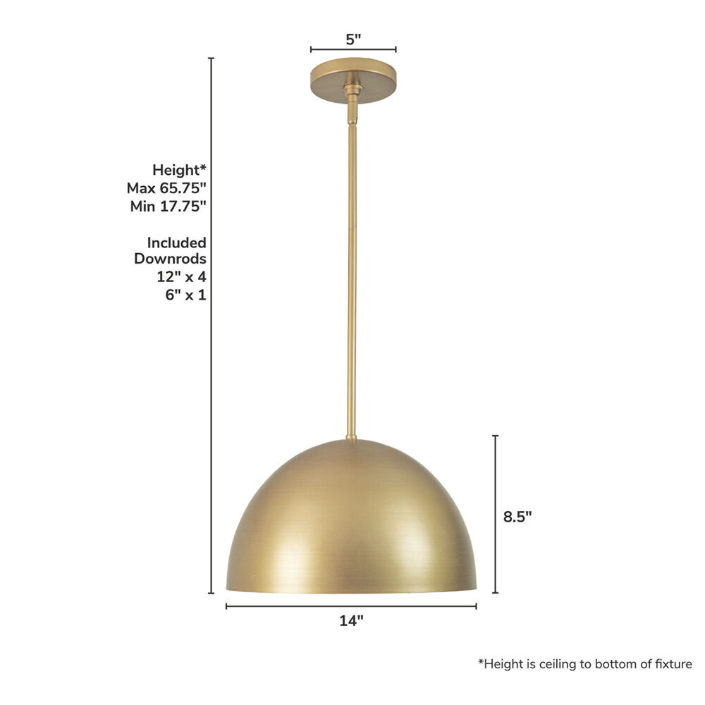The following are detailed specifications about the Hunter Fan Company Erling Luxe Gold Pendant Light with Bowl / Dome Shade.