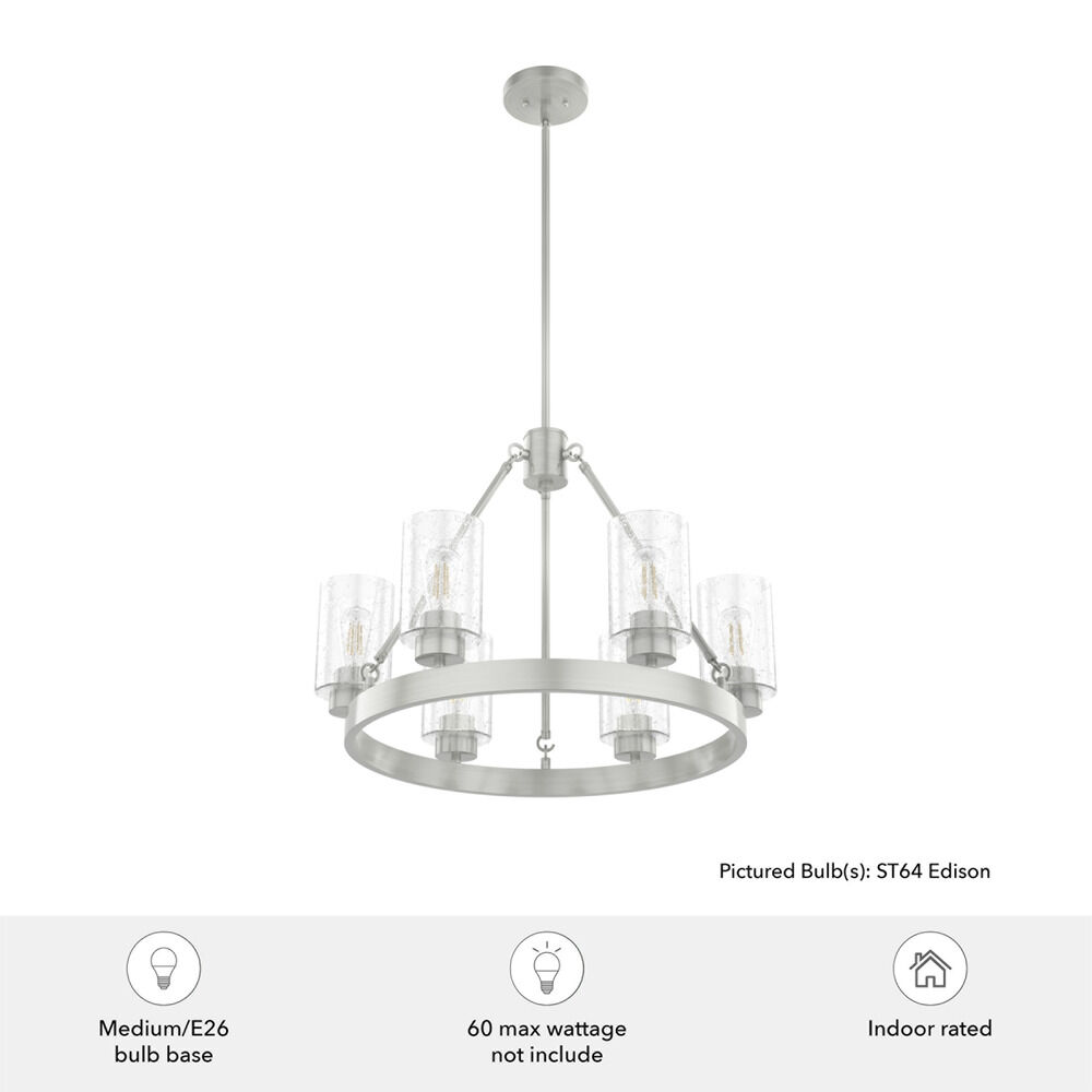 Contemporary / modern brushed nickel 6-light chandelier with clear,seeded seeded glass shade