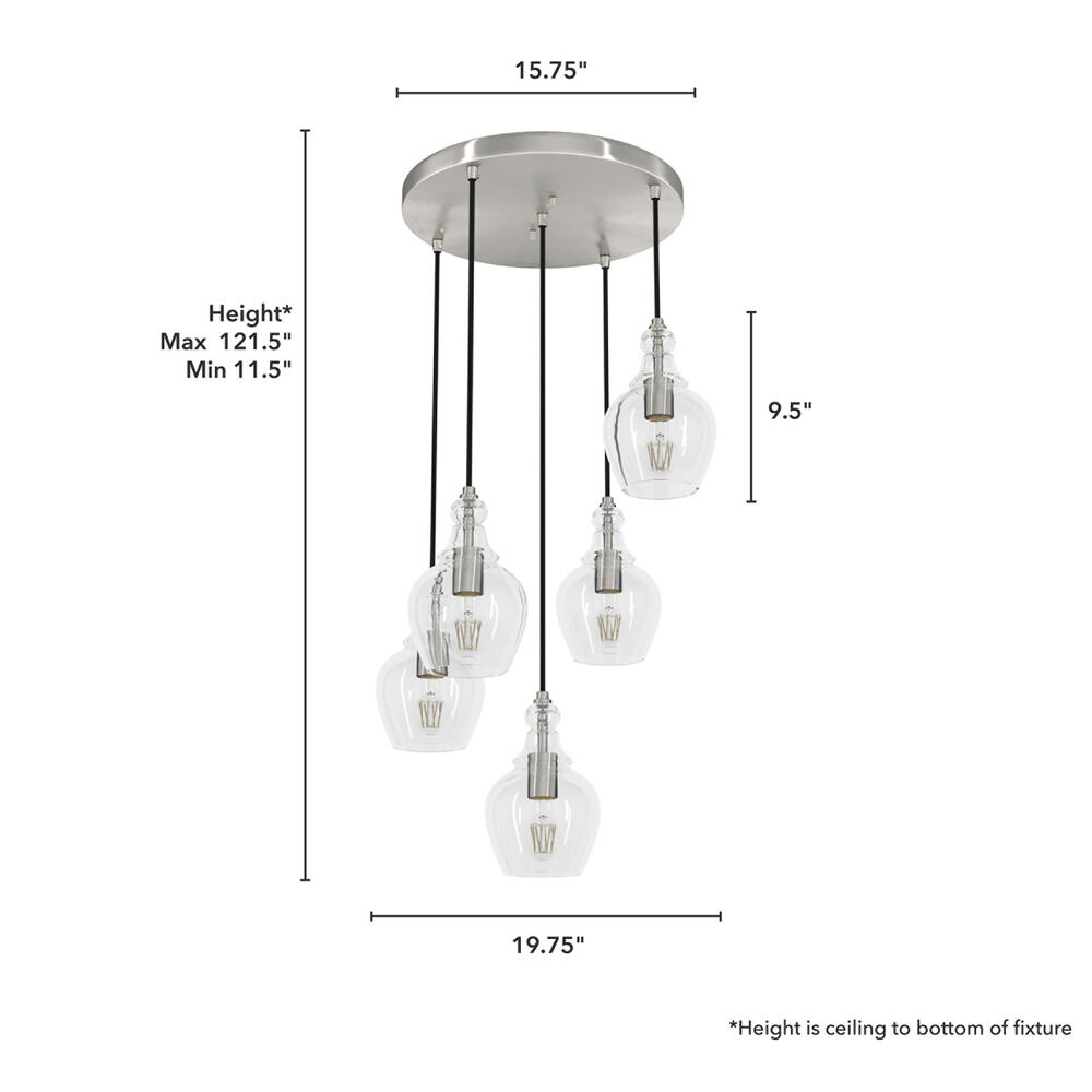 Contemporary / modern brushed nickel 5-light pendant light with clear glass shade