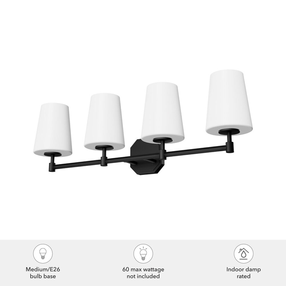 Contemporary / modern matte black 4-light bathroom light with cased white glass shade