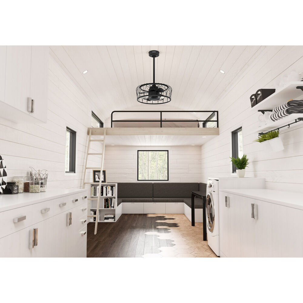 Transitional matte black 3-light indoor ceiling fan with matte black cage shade