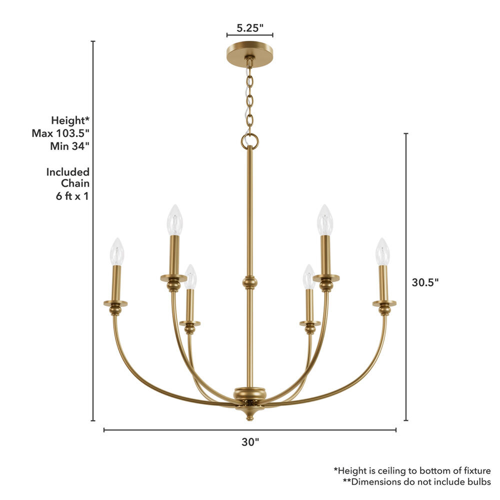 The following are detailed specifications about the Hunter Fan Company Southcrest Luxe Gold Chandelier.