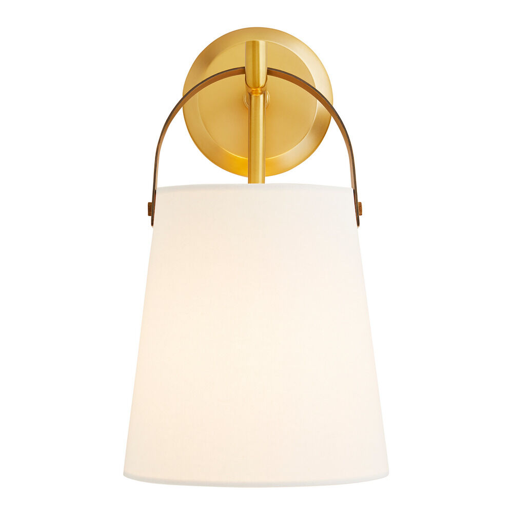 The Ian Sconce by Arteriors Home features an Antique Brass round steel backplate that acts as a hook to present a White linen shade. This linen shade is suspended by an English Bronze steel strap. The Ian is rated for use in damp locations.