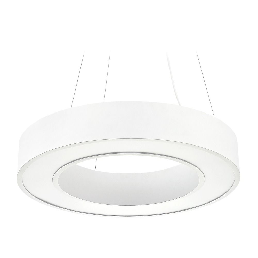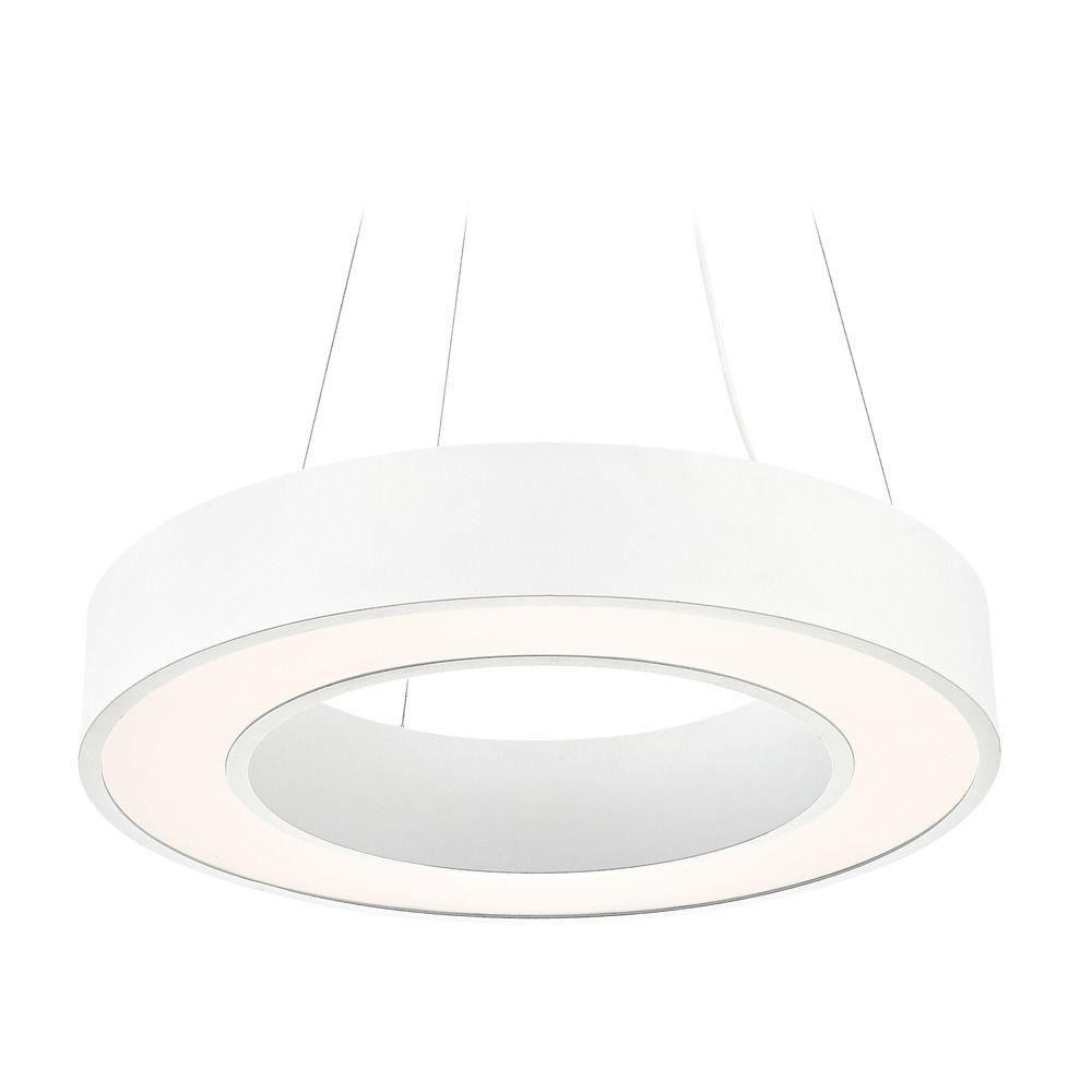 Matte white 1-light pendant light with round doughnut acrylic shade. Dia. 23-5/8-inch circular ring in white acrylic. Integrated LED so no bulbs are required for installation or maintenance. Runs off of 45-watts LED with 3120 lumens, equivalent light to 200-watts incandescent. 0-10V dimmable with LED compatible dimmer, 120V line voltage. 3000K bulb color temperature with a CRI 90. Rated to last up to 50,000 hours. The height can be adjusted between 15-inches and 125.75-inches. Suitable for installation in dry locations only. 120 volts line voltage. ETL / CETL certified.