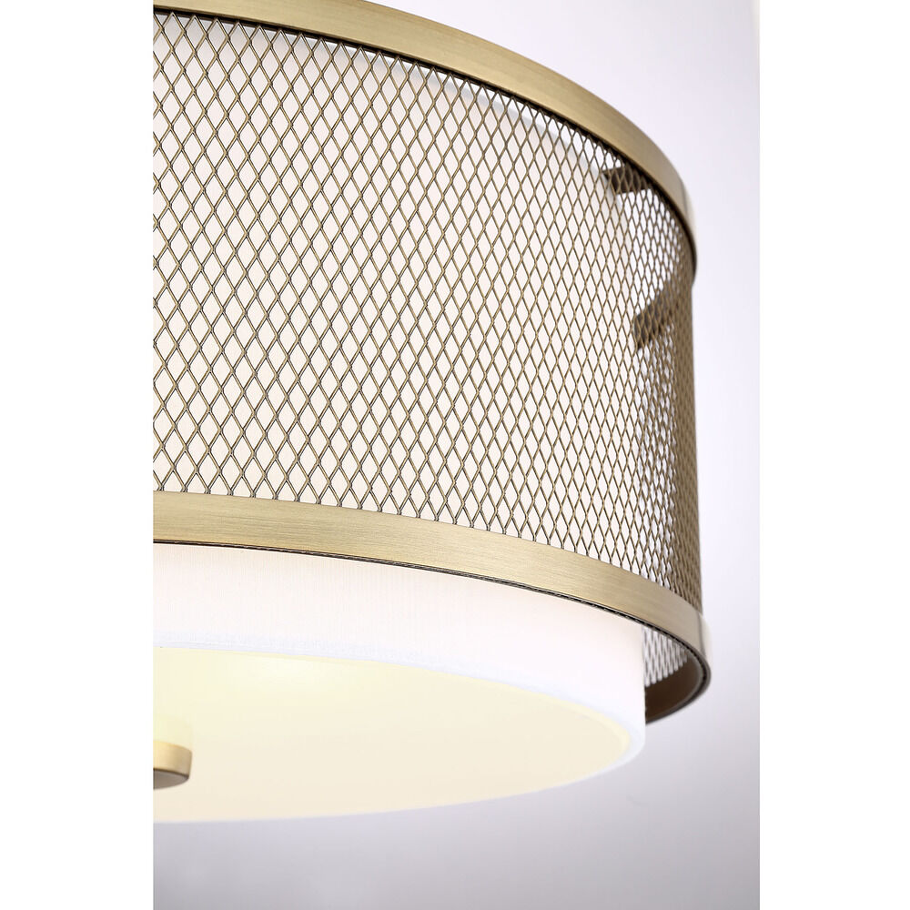 Brighten your space with this 14.75-inch flush mount by Meridian. This ceiling mount features a White fabric shade that is surrounded by a Natural Brass metal mesh shade. Three light bulbs are required and are sold separately.